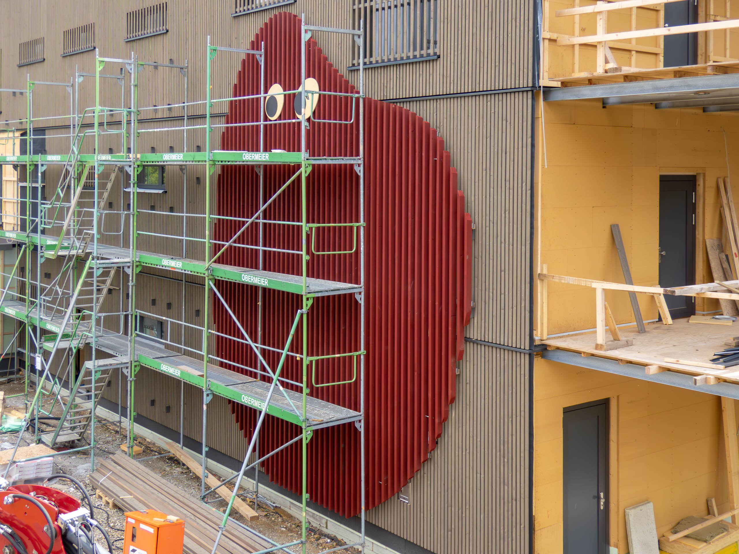 Das Gebäude erhält derzeit ein sehr nettes Designelement. Die Figuren an der Fassade sollen wohl Geister darstellen. Diese Elemente sind bereits auf der Computergrafik aus der Planung sichtbar. Wie üblich fällt alles immer ein bisschen anders aus. Hier aber scheinen die Geister weit schöner als ursprünglich vorgesehen zu werden.