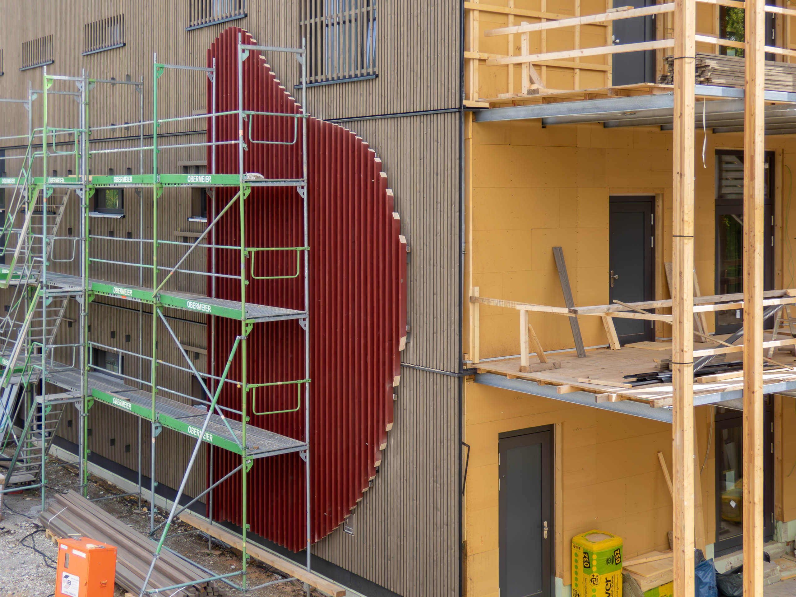 Der Bau wird in Holzbauweise errichtet, wobei Brettsperrholzwände und Holzkastenelemente zum Einsatz kommen. Die Fassade wird in Gestalt einer hinterlüfteten Holzfassade gebaut und an den vorgestellten Außentreppen begrünt. Die Dächer erhalten intensive Begrünung und eine Photovoltaikanlage.