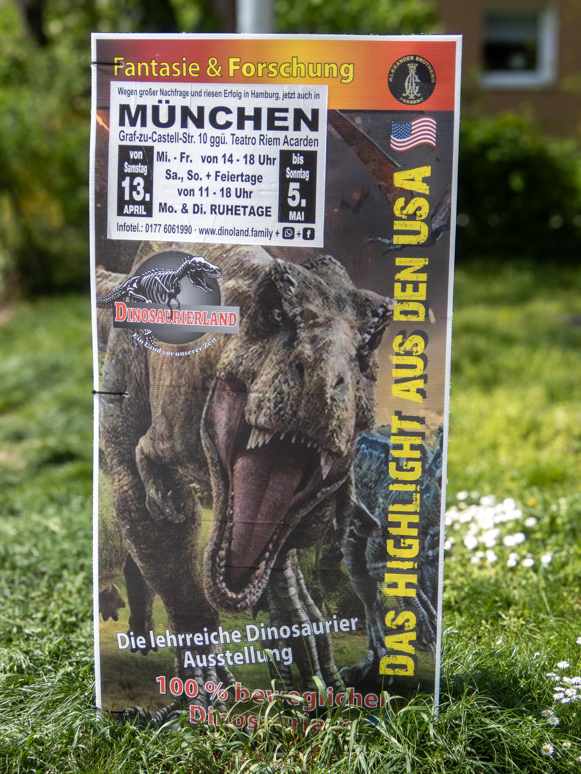 Ich lege noch einmal Werbeplakate von World of Dinos bei. Damals hieß es: „Dinosaurier – Reiten, Anfassen, Füttern, live erleben“. Wer auf Dinosaurier nicht verzichten will: Noch bis 5. Mai findet in der Nähe der Riem Arcaden die Ausstellung „Dinosaurierland“ statt. Auch hierzu ein Plakat.