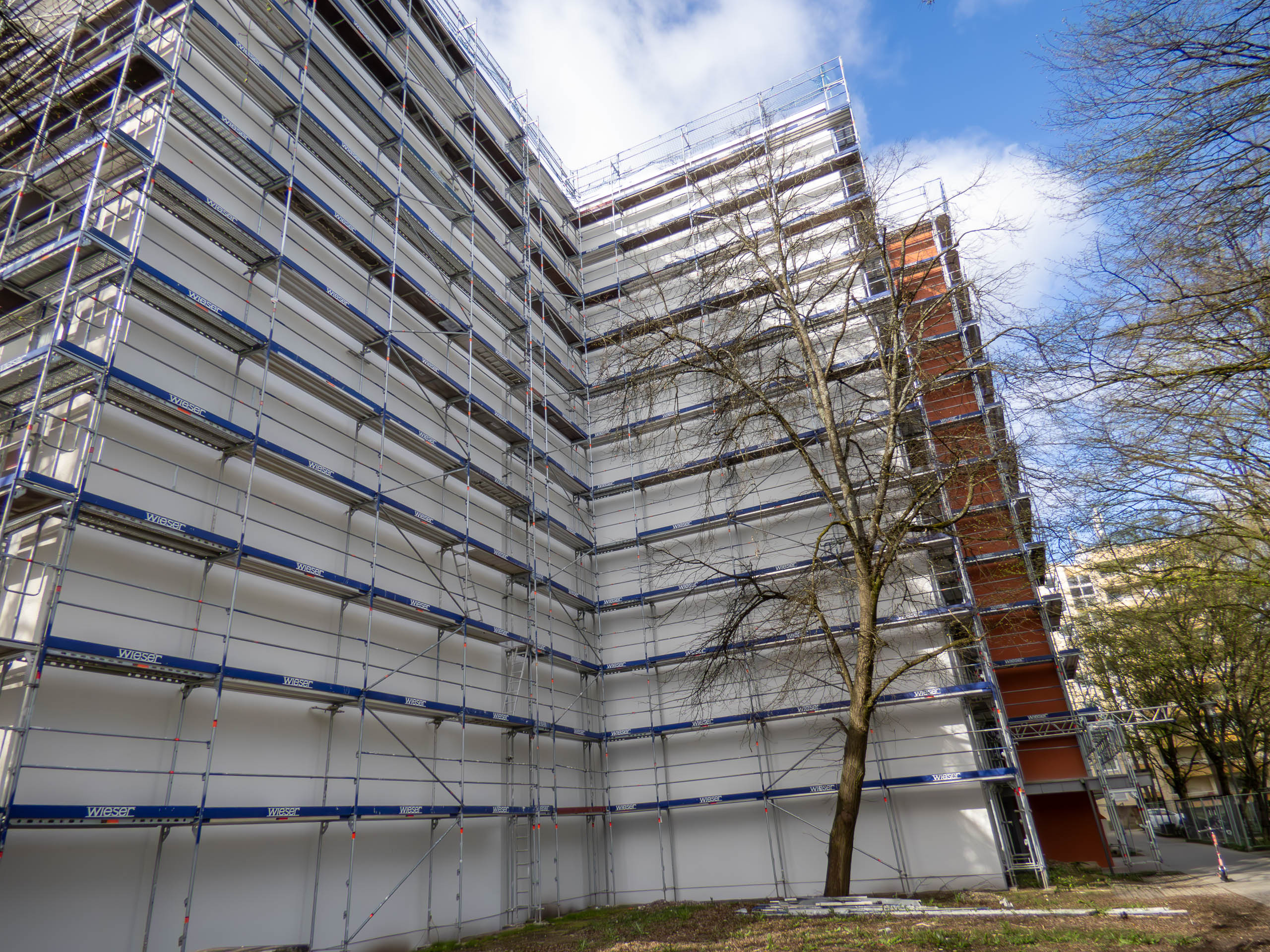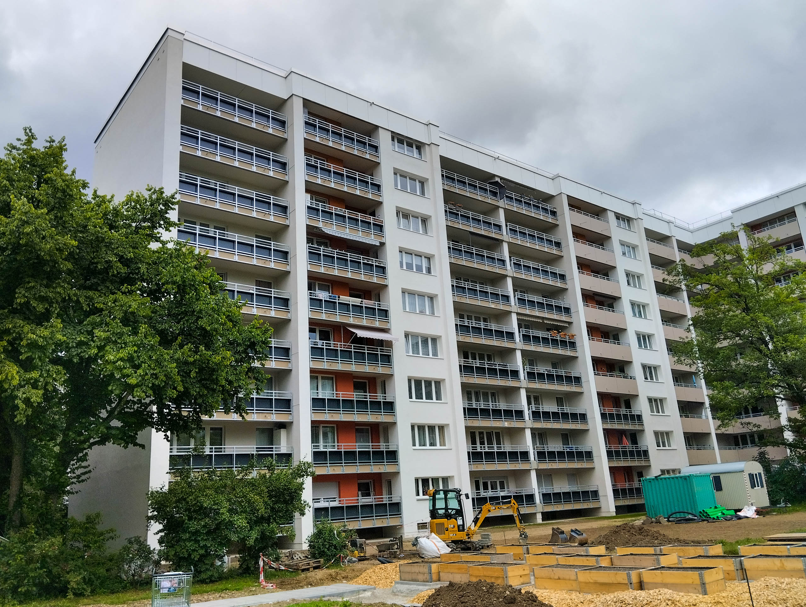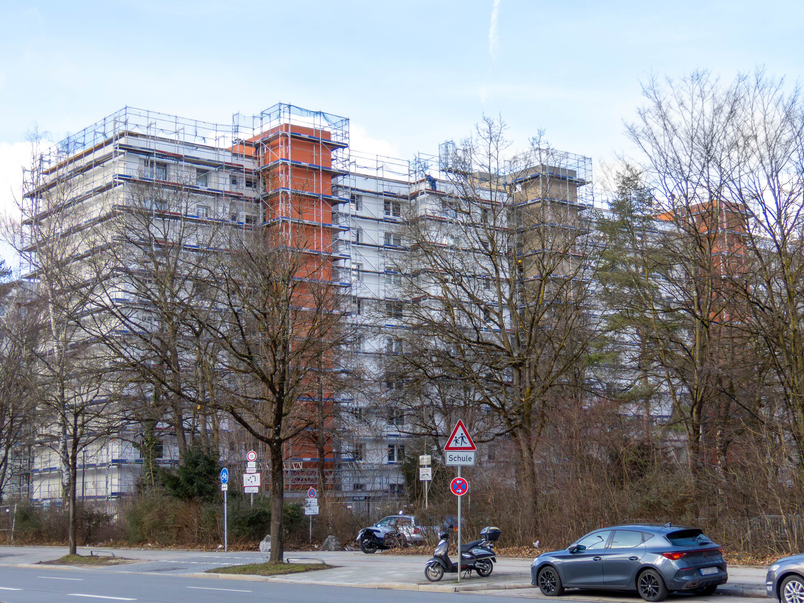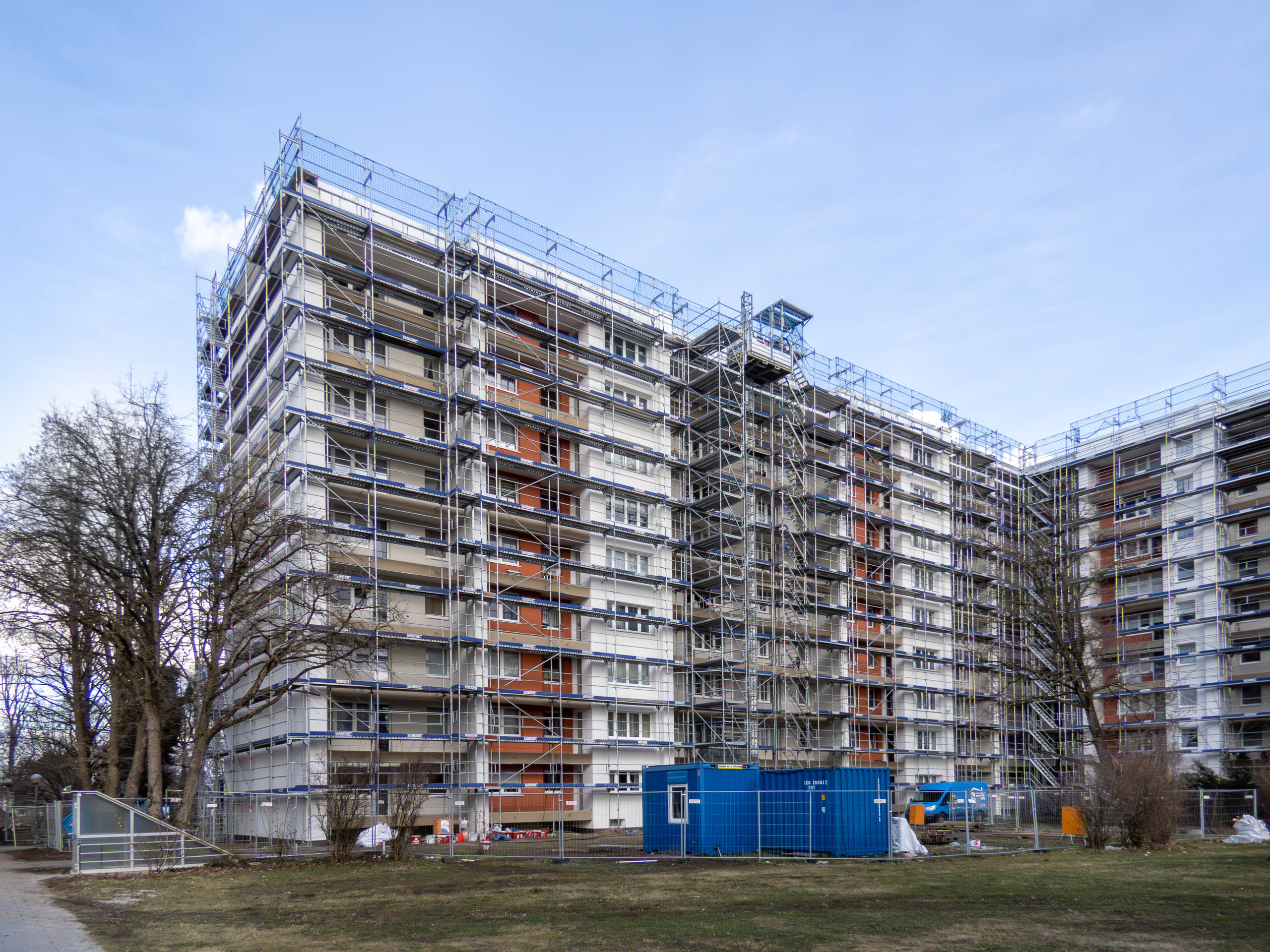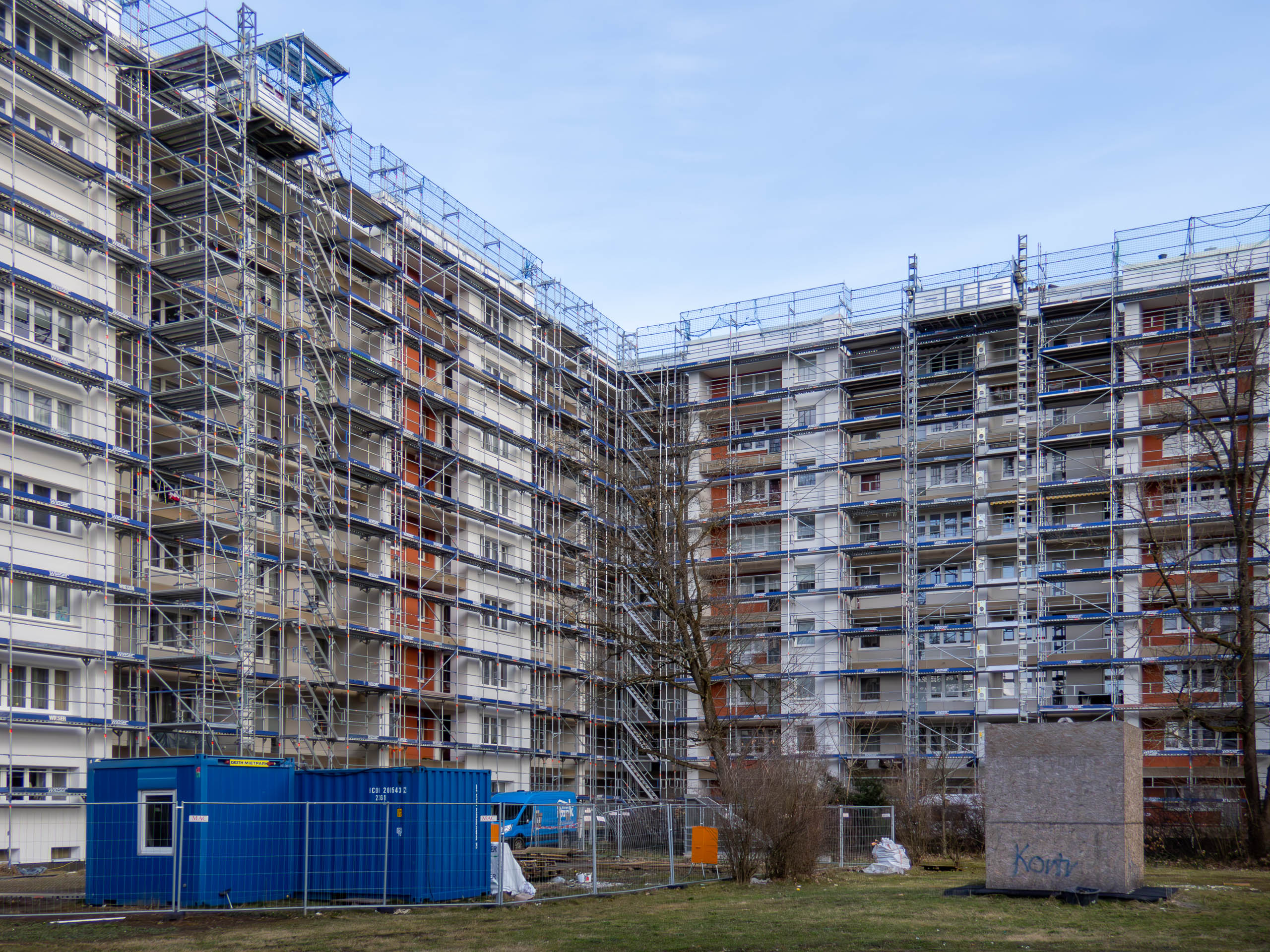 Vor fast 1½ Jahren begann die Sanierung. Doch noch immer ist ein Gerüst aufgebaut und an den Balkonen fehlen die Geländer. Jetzt endlich im November oder Dezember soll das Gerüst demontiert werden. Im Anschluss daran sollen die neuen Balkongeländer angebracht werden. Für das Frühjahr 2024 ist dann schließlich die Wiederherstellung der Außenanlagen vorgesehen. Damit würde man ziemlich exakt 1 Jahr im Verzug sein.
