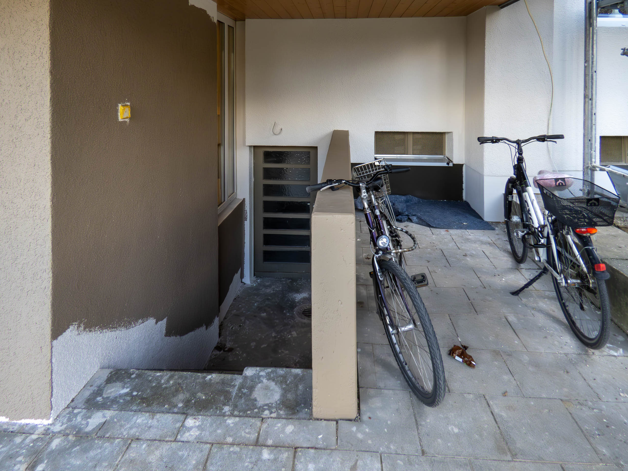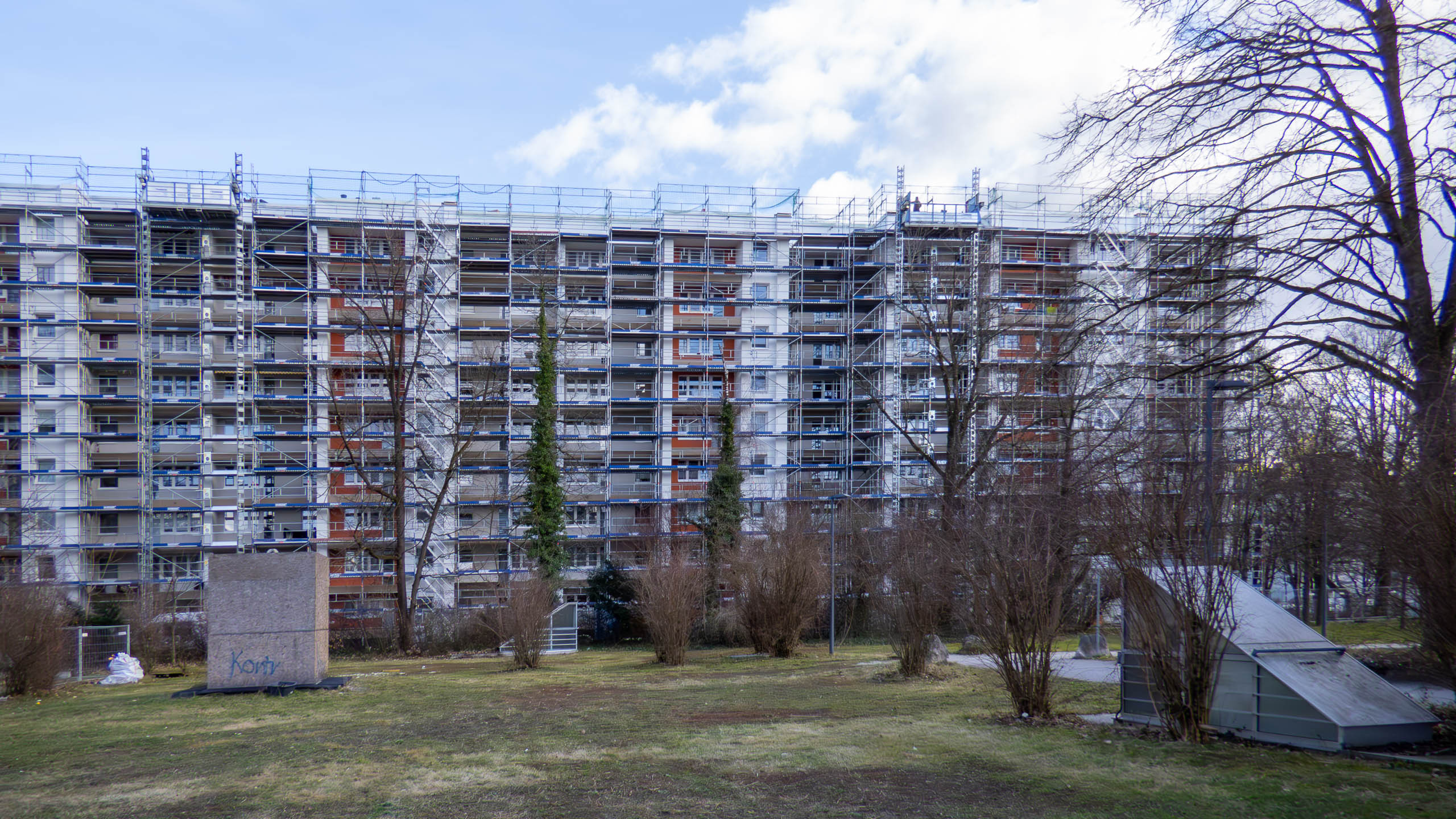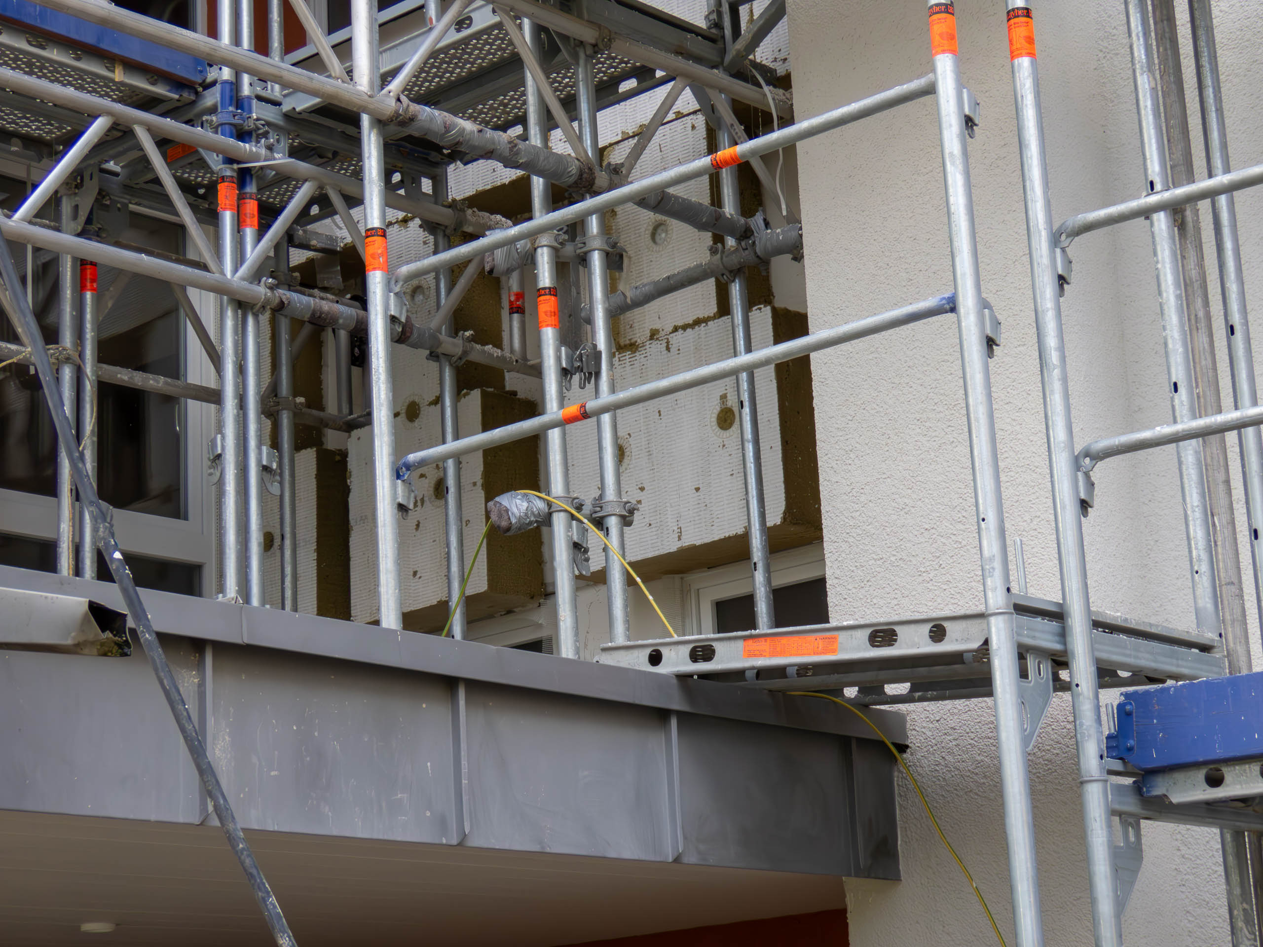 Für die Bewohner ist das sicherlich frustrierend. Noch immer ist das Haus eingerüstet. Die Balkone sind ohne Geländer nicht benutzbar.
