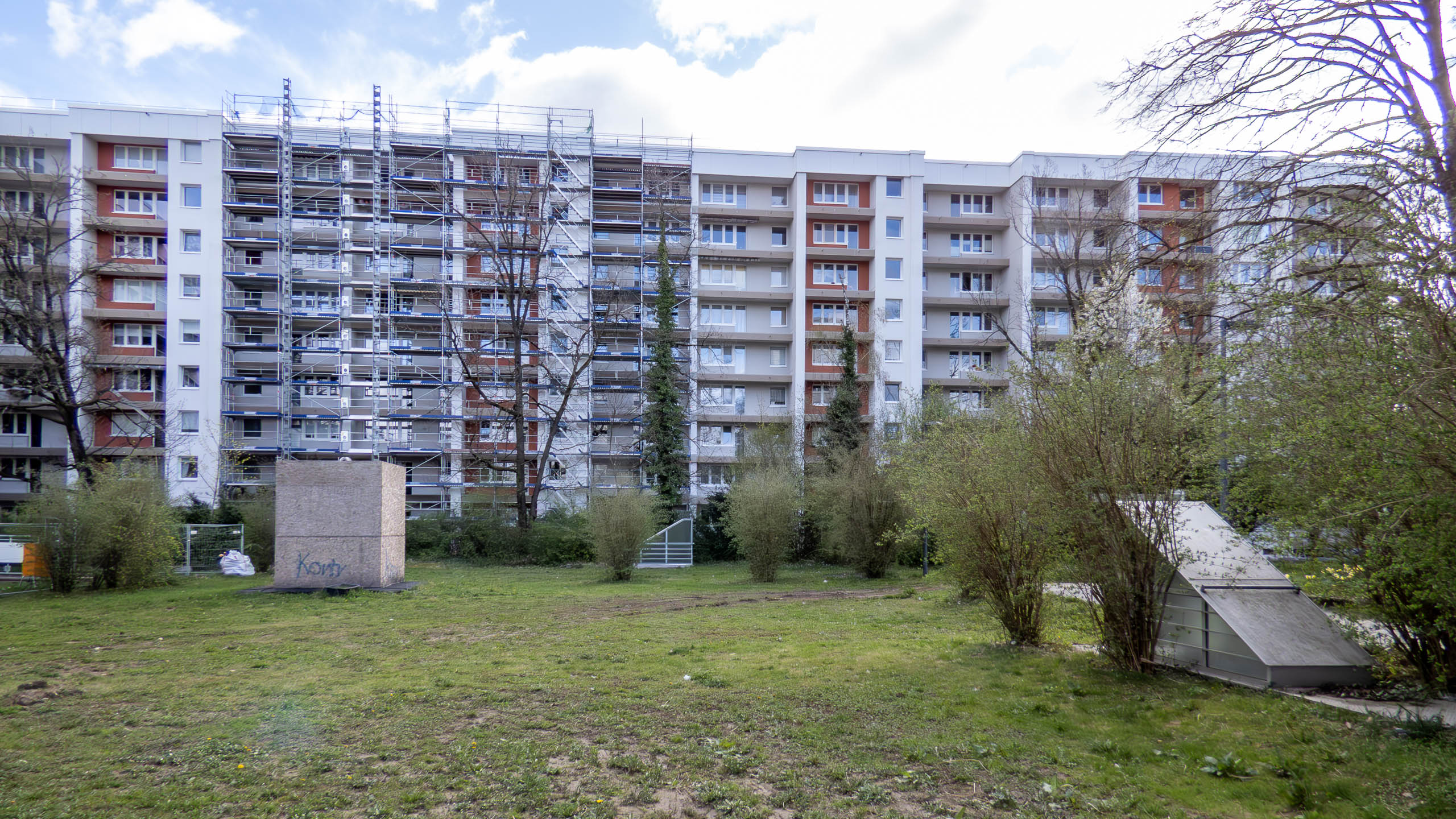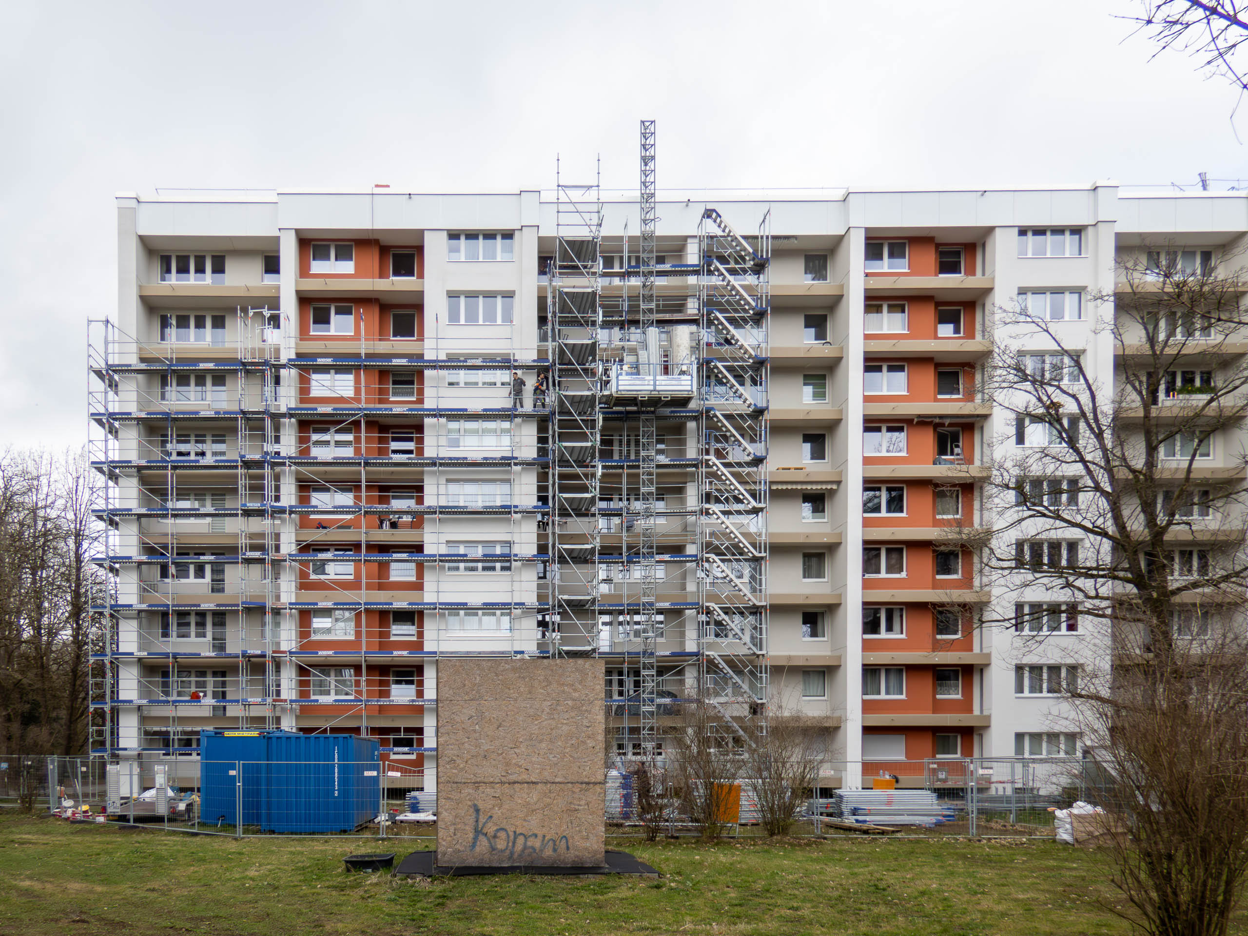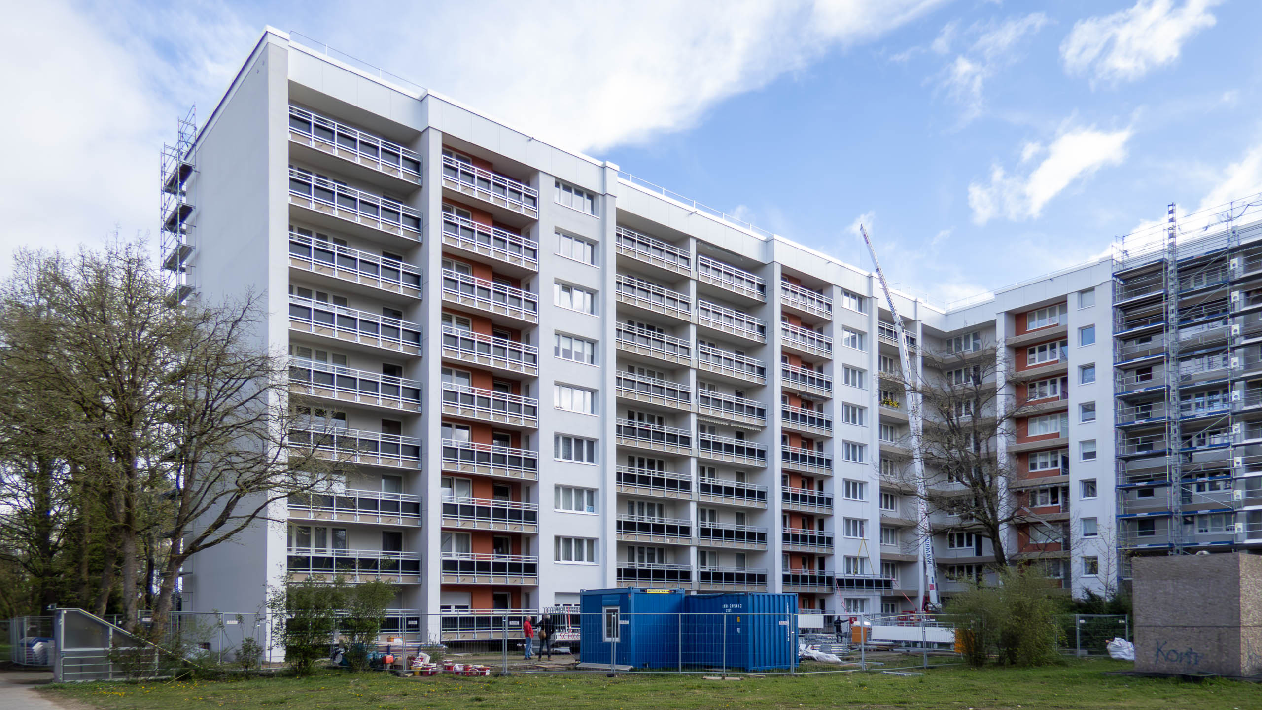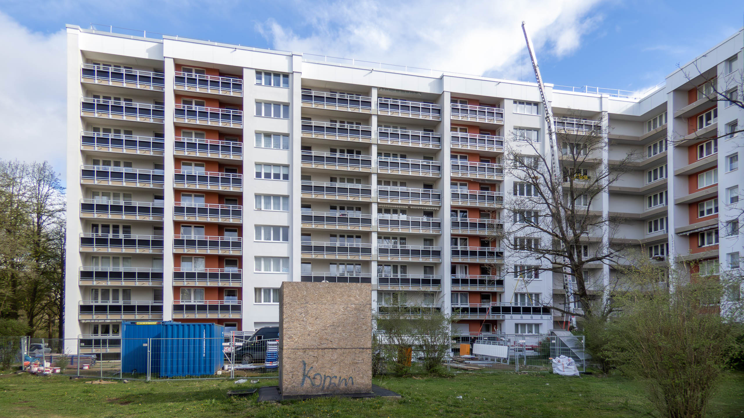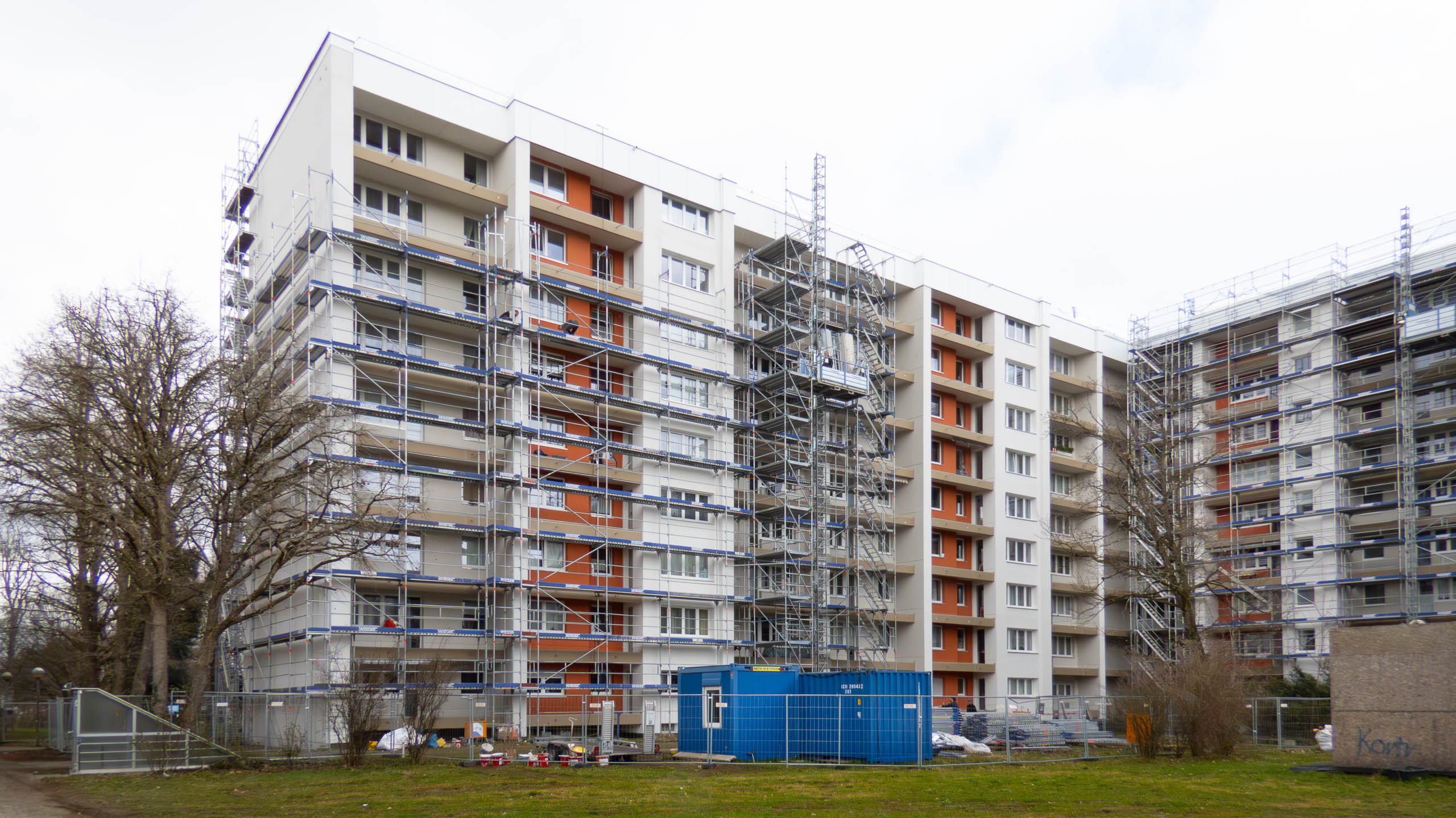 Heute hat man an der Wohnanlage Karl-Marx-Ring 11–21 mit dem Gerüstabbau begonnen. Doch die Sanierung ist damit noch nicht beendet. Denn die Balkone haben noch keine Geländer und dürfen entsprechend noch nicht benutzt werden.