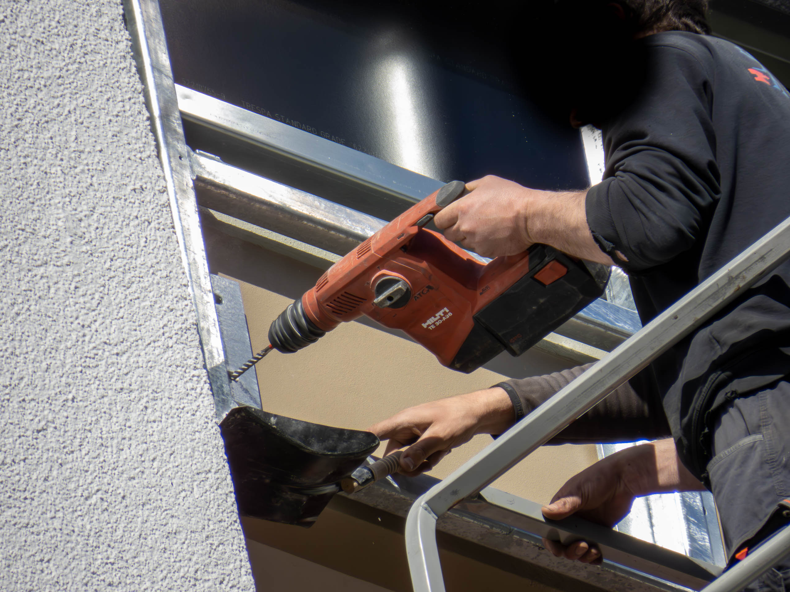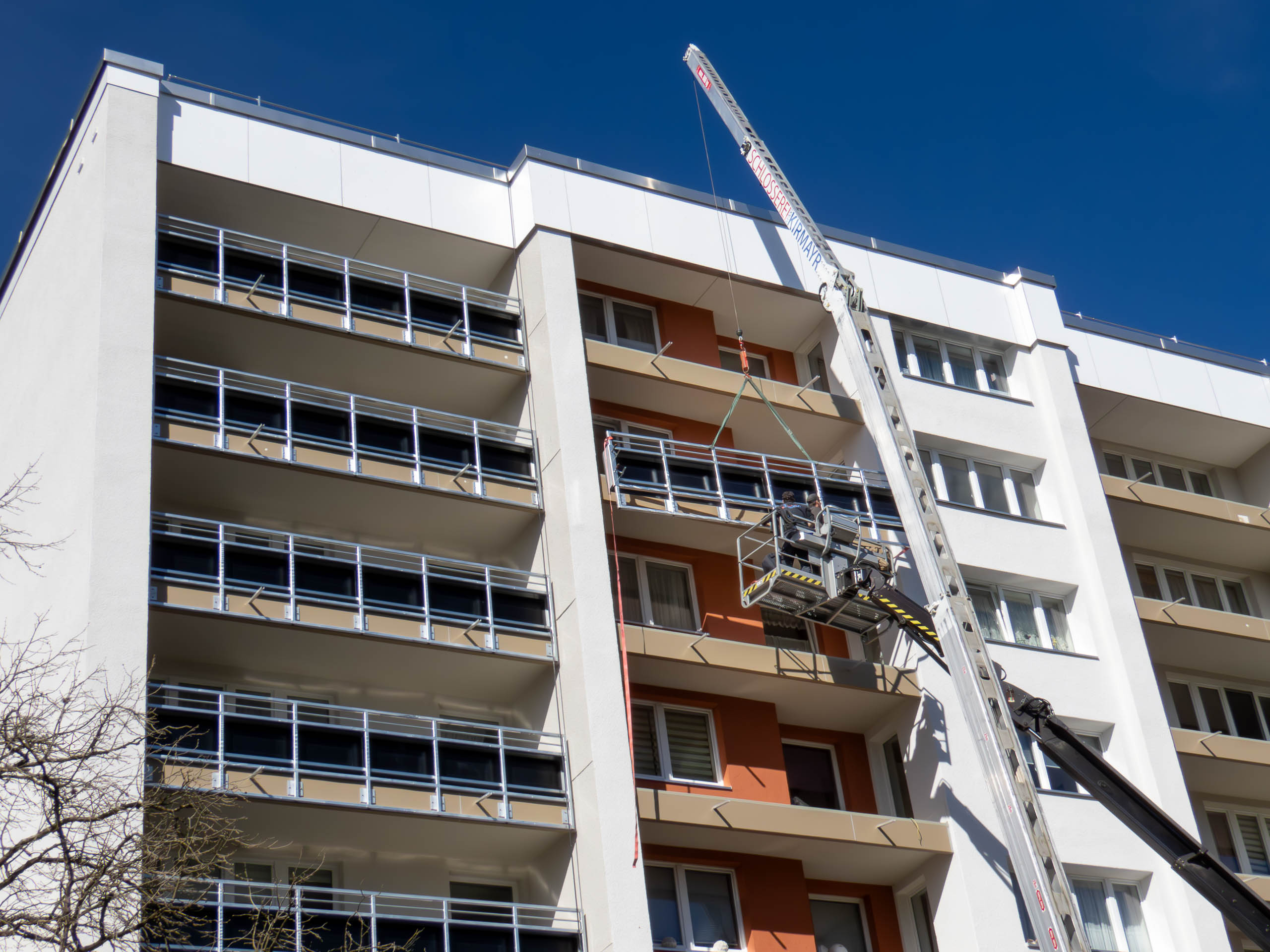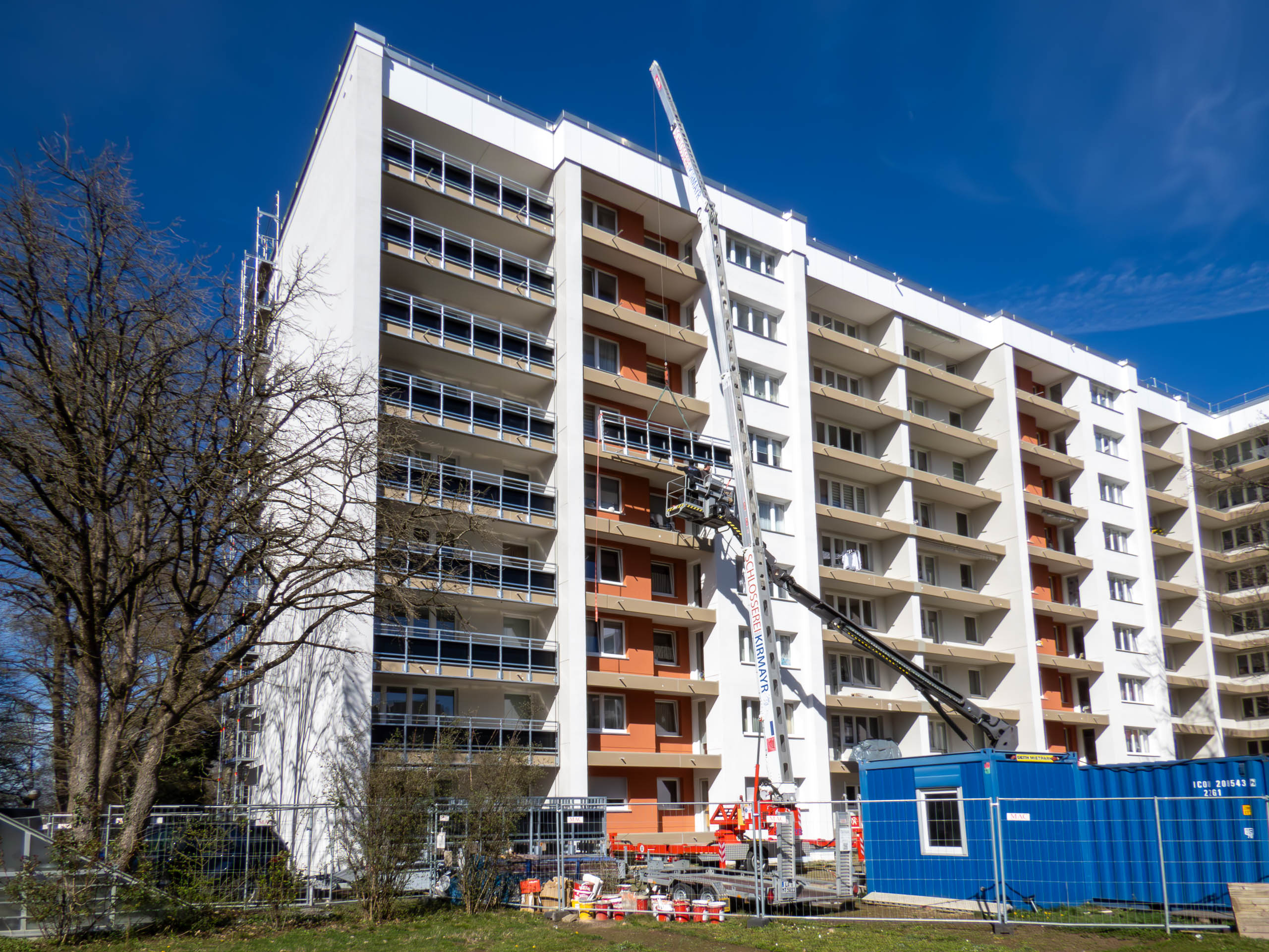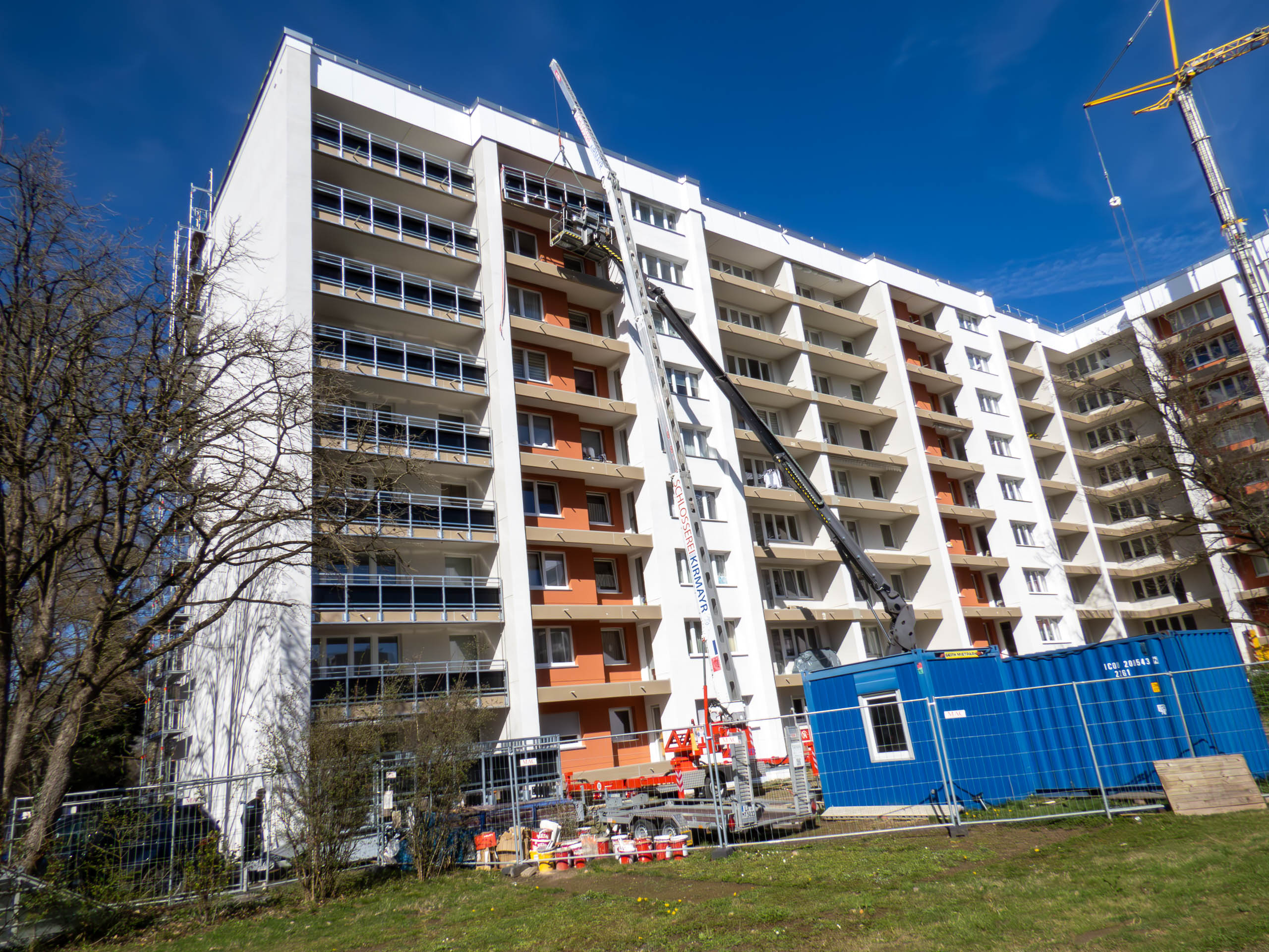 Derzeit werden die Balkonbrüstungen abgesägt. Hier sind die einzelnen Phasen des Absägens zu sehen. Dabei werden erst von außen Löcher in die Brüstungen gebohrt und dann wird eine Schiene angebracht. Dort läuft das runde Sägeblatt zweimal durch. Das dauert nur wenige Minuten, und schon ist ein großes Brüstungselement entfernt. Das Ganze wird über eine Hebebühne realisiert. Ich spekuliere mal, dass sich auf diese Weise der Abtransport der Brüstungselemente mit dem mobilen Kran einfacher gestaltet, als wenn ein Gerüst im Weg wäre.