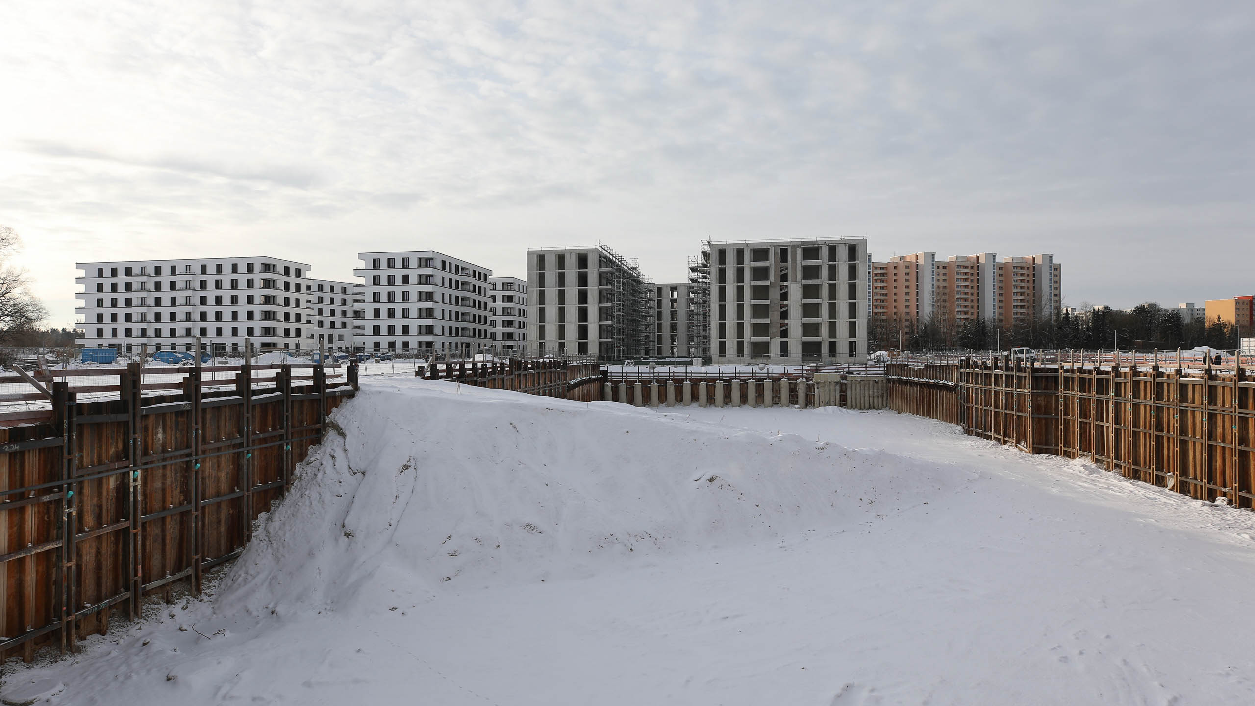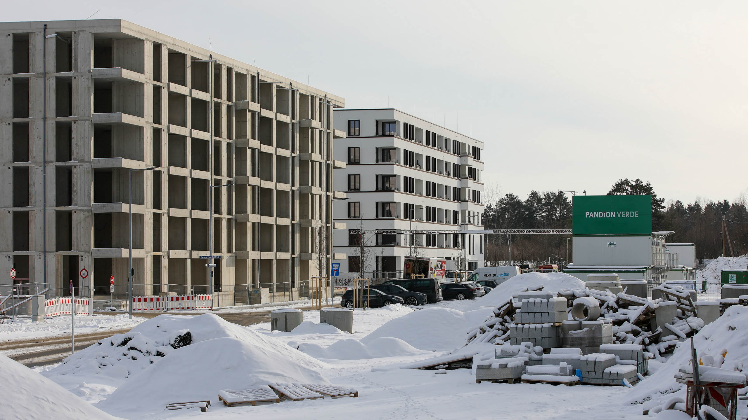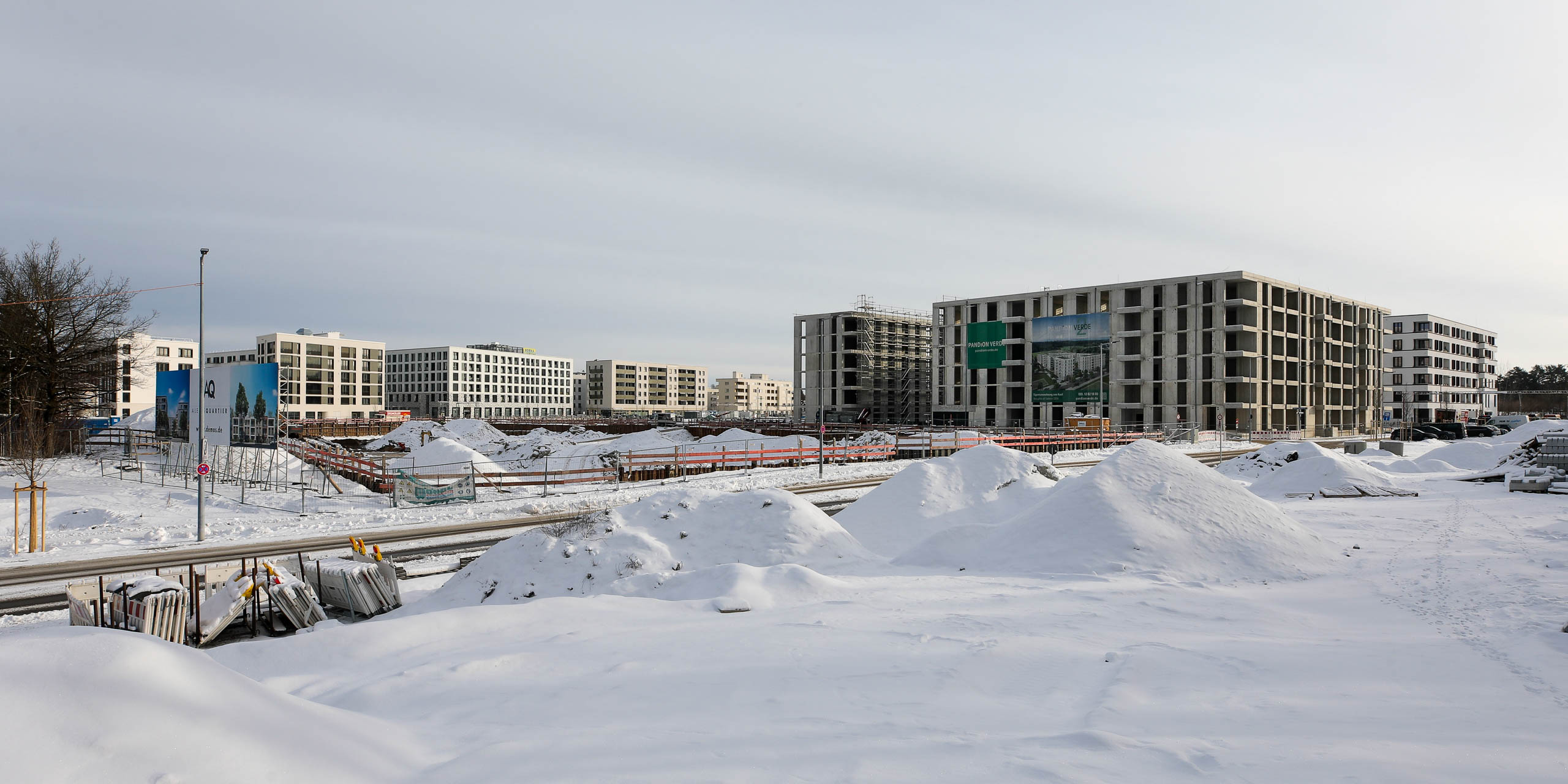 Was jetzt noch sehr seltsam aussieht und für viele Fragen sorgt, ist in Wirklichkeit die Vorbereitung für – wer hätte es gedacht – den Bau von Wohnhäusern. Dabei realisiert das Kölner Unternehmen Pandion sein Projekt Pandion Verde. In zwei Bauabschnitten werden 256 Eigentumswohnungen entstehen. Derzeit wird am ersten Abschnitt WA 8 mit 133 Wohnungen gearbeitet. Die Häuser werden fünf Stockwerke aufweisen und voraussichtlich 2023 bezugsfertig sein.