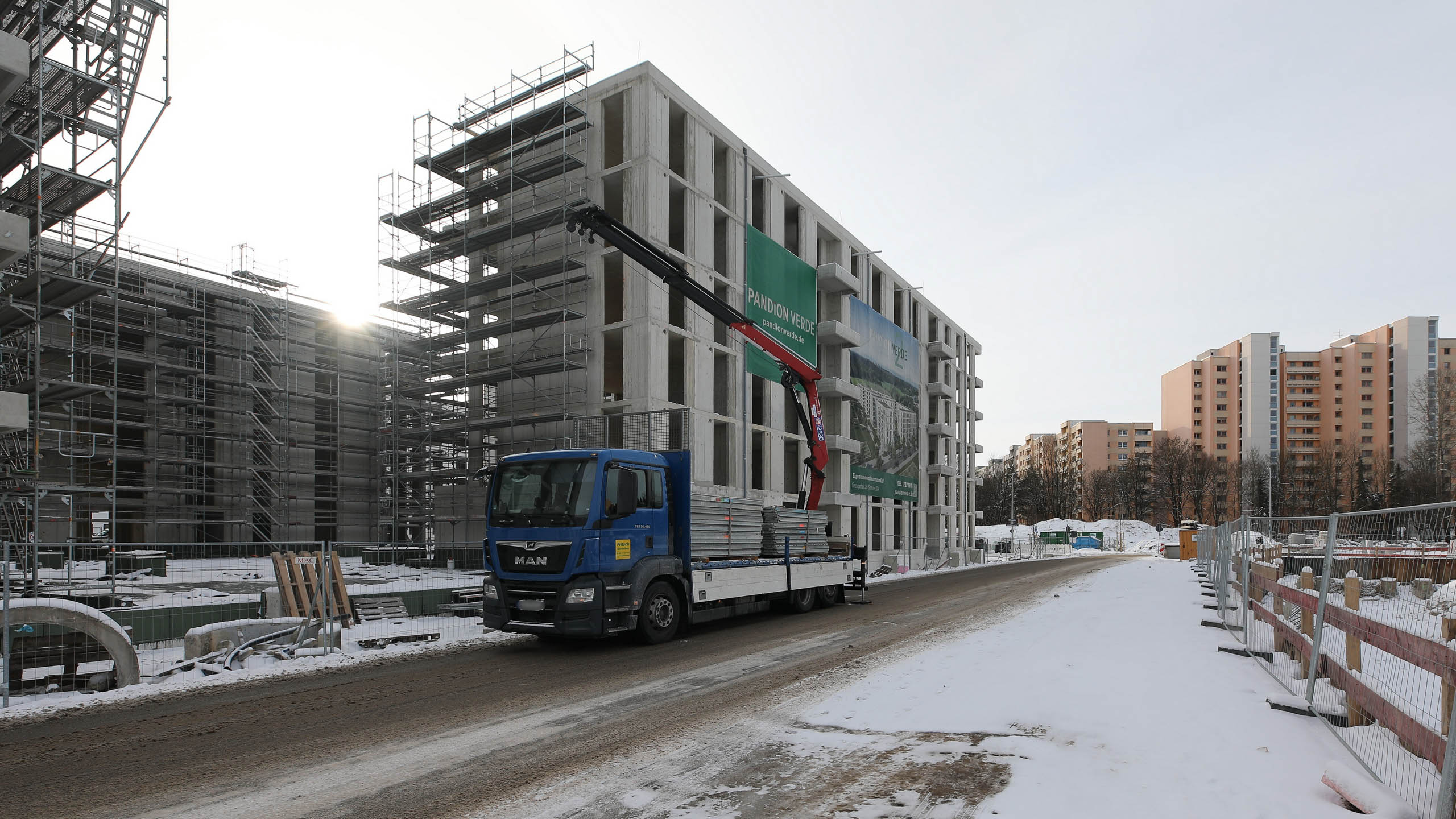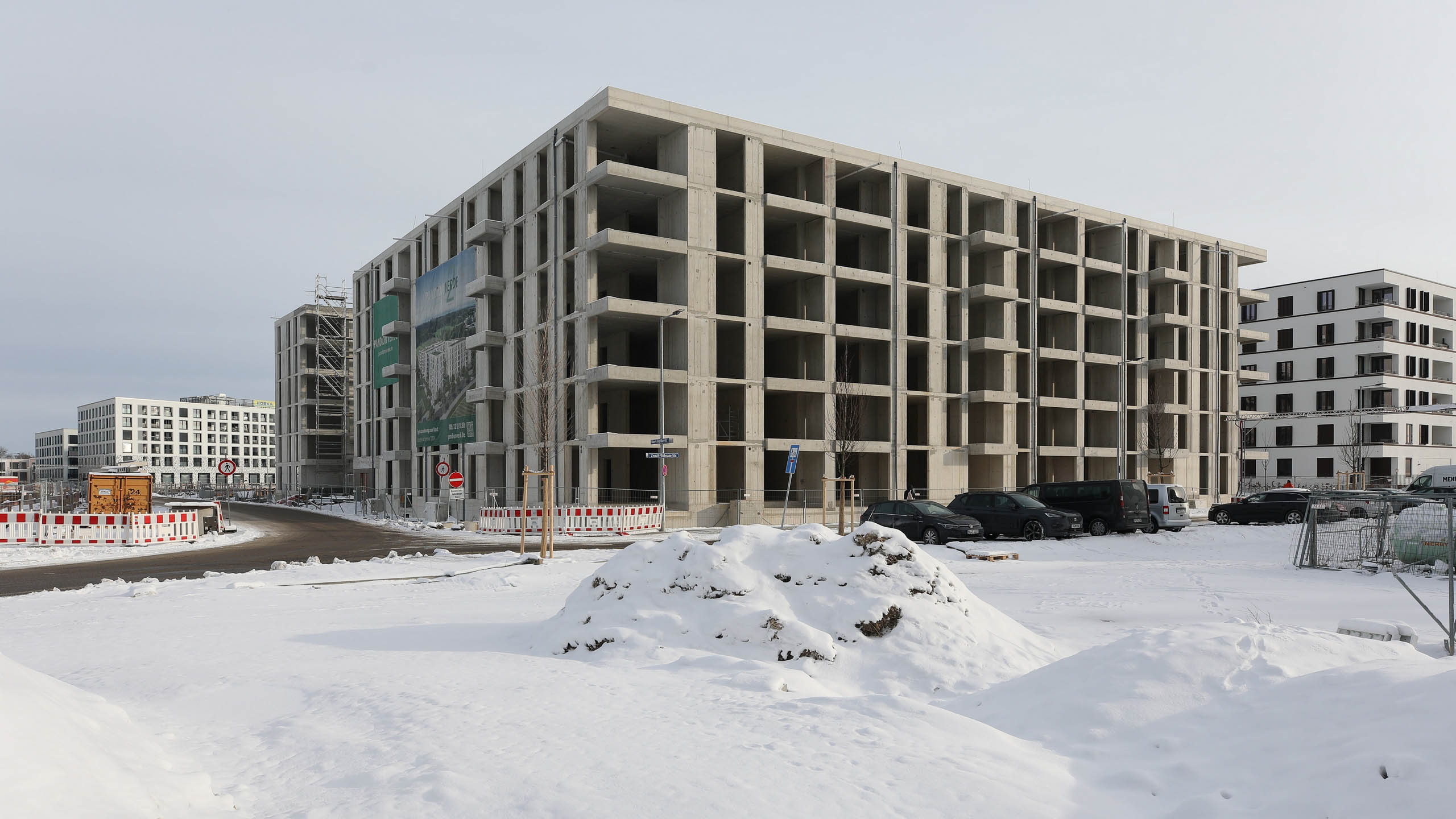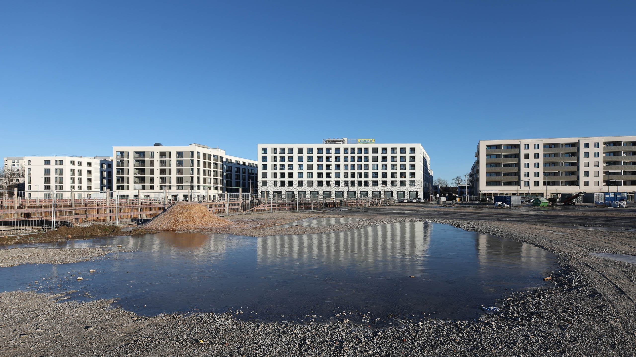 Was jetzt noch sehr seltsam aussieht und für viele Fragen sorgt, ist in Wirklichkeit die Vorbereitung für – wer hätte es gedacht – den Bau von Wohnhäusern. Dabei realisiert das Kölner Unternehmen Pandion sein Projekt Pandion Verde. In zwei Bauabschnitten werden 256 Eigentumswohnungen entstehen. Derzeit wird am ersten Abschnitt WA 8 mit 133 Wohnungen gearbeitet. Die Häuser werden fünf Stockwerke aufweisen und voraussichtlich 2023 bezugsfertig sein.
