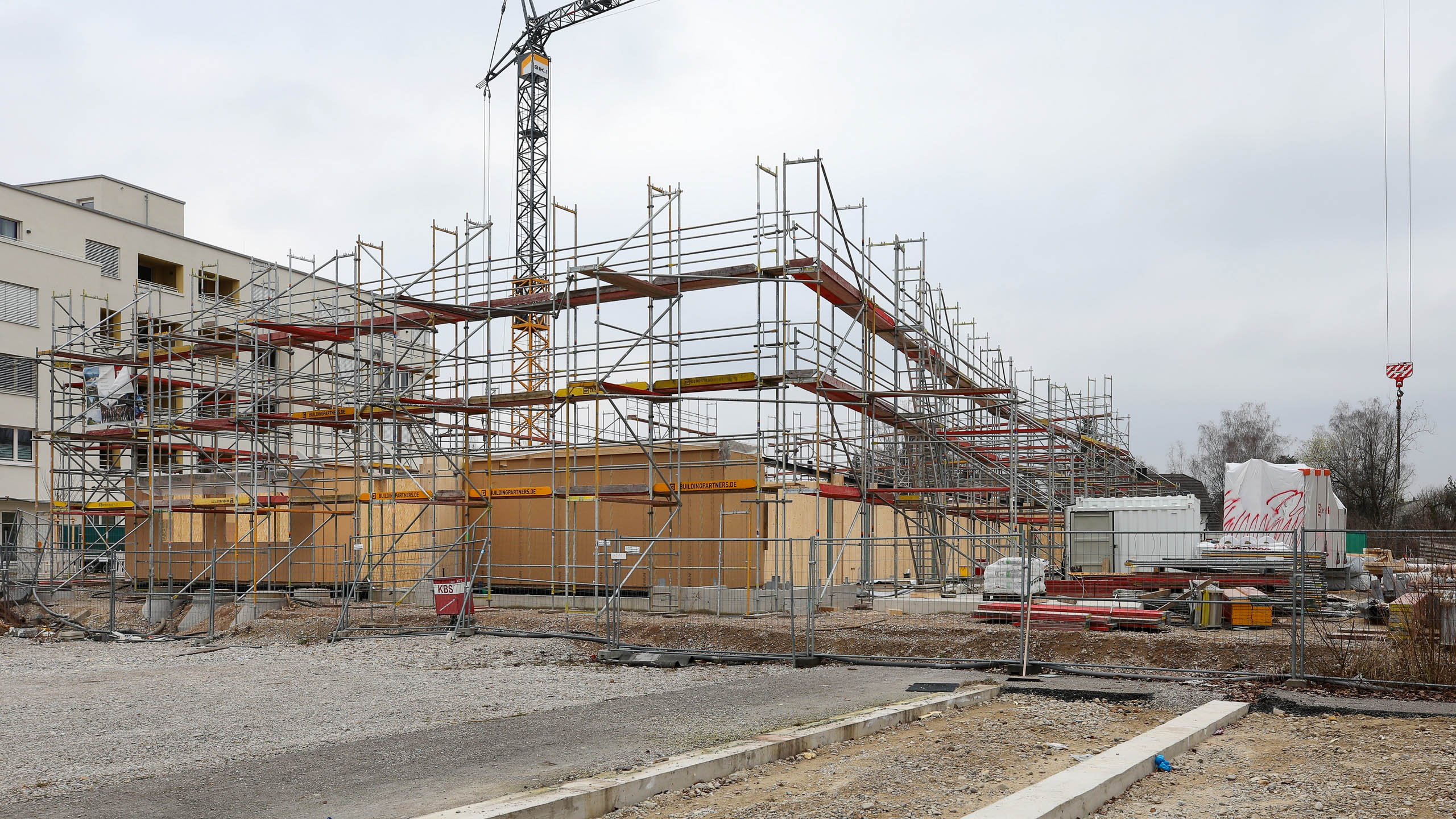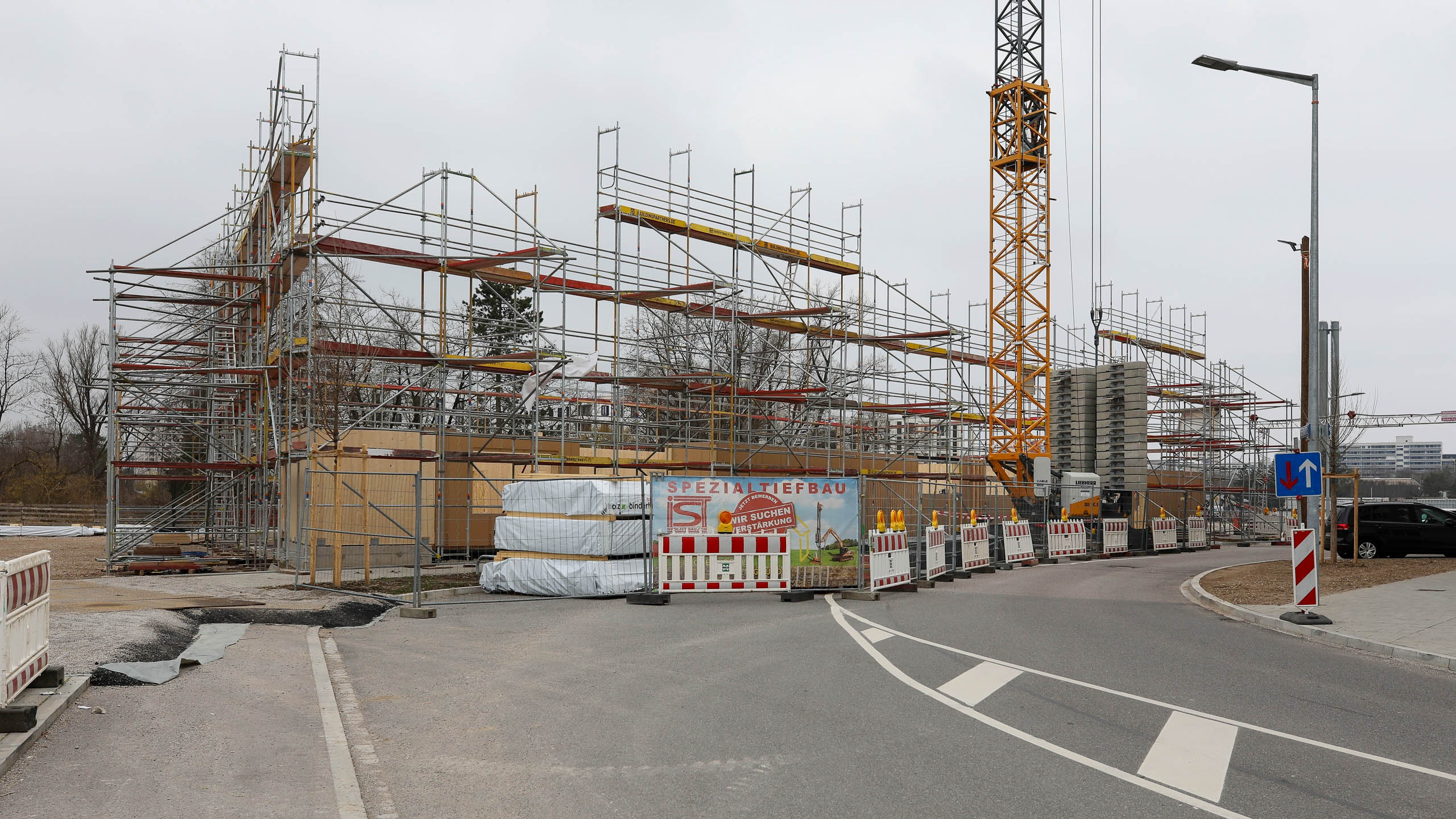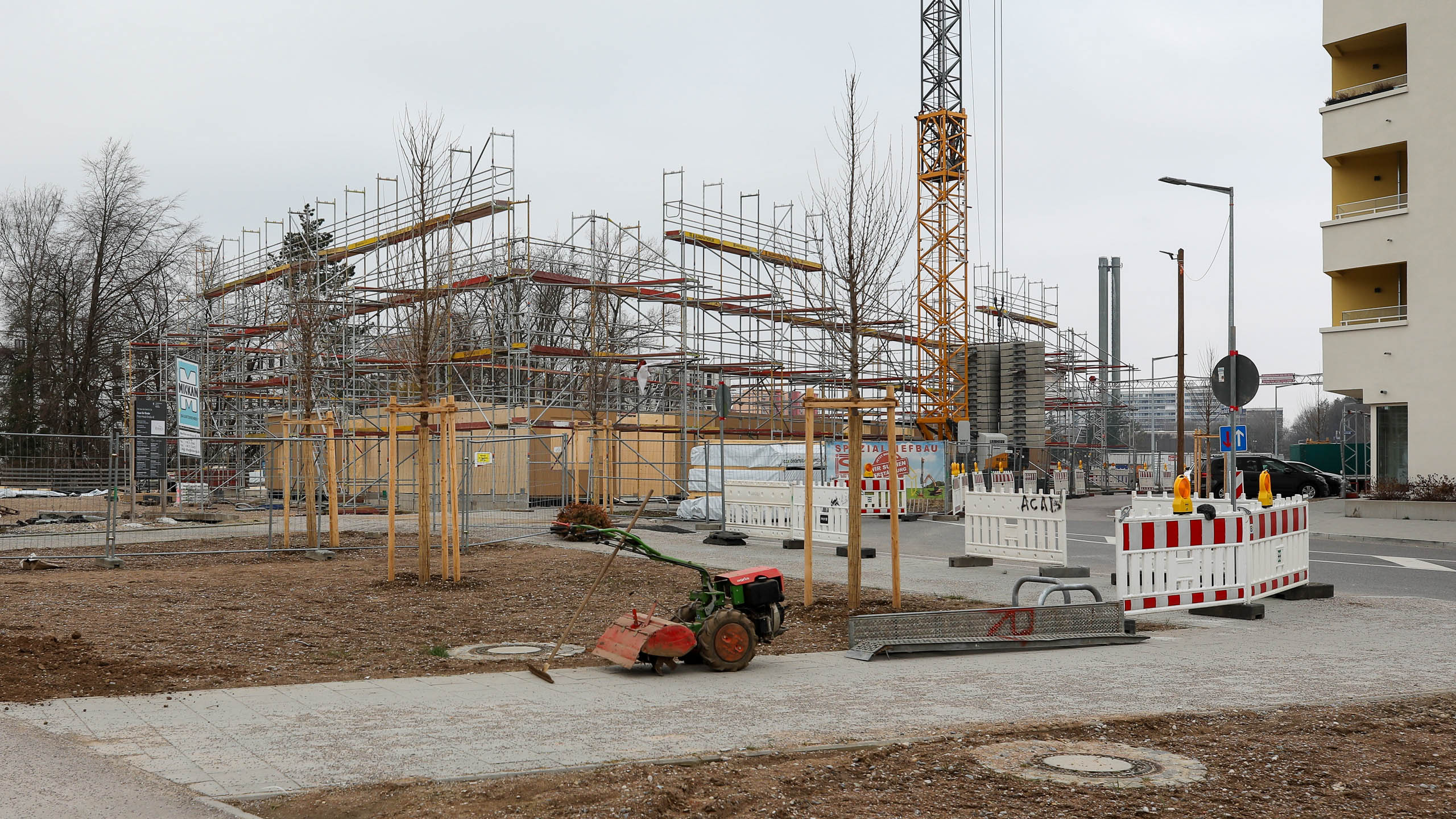 Nachdem die Pfahlgründung beendet wurde, starten nun die Hochbauarbeiten. Gestern wurde der erste Kran aufgestellt.