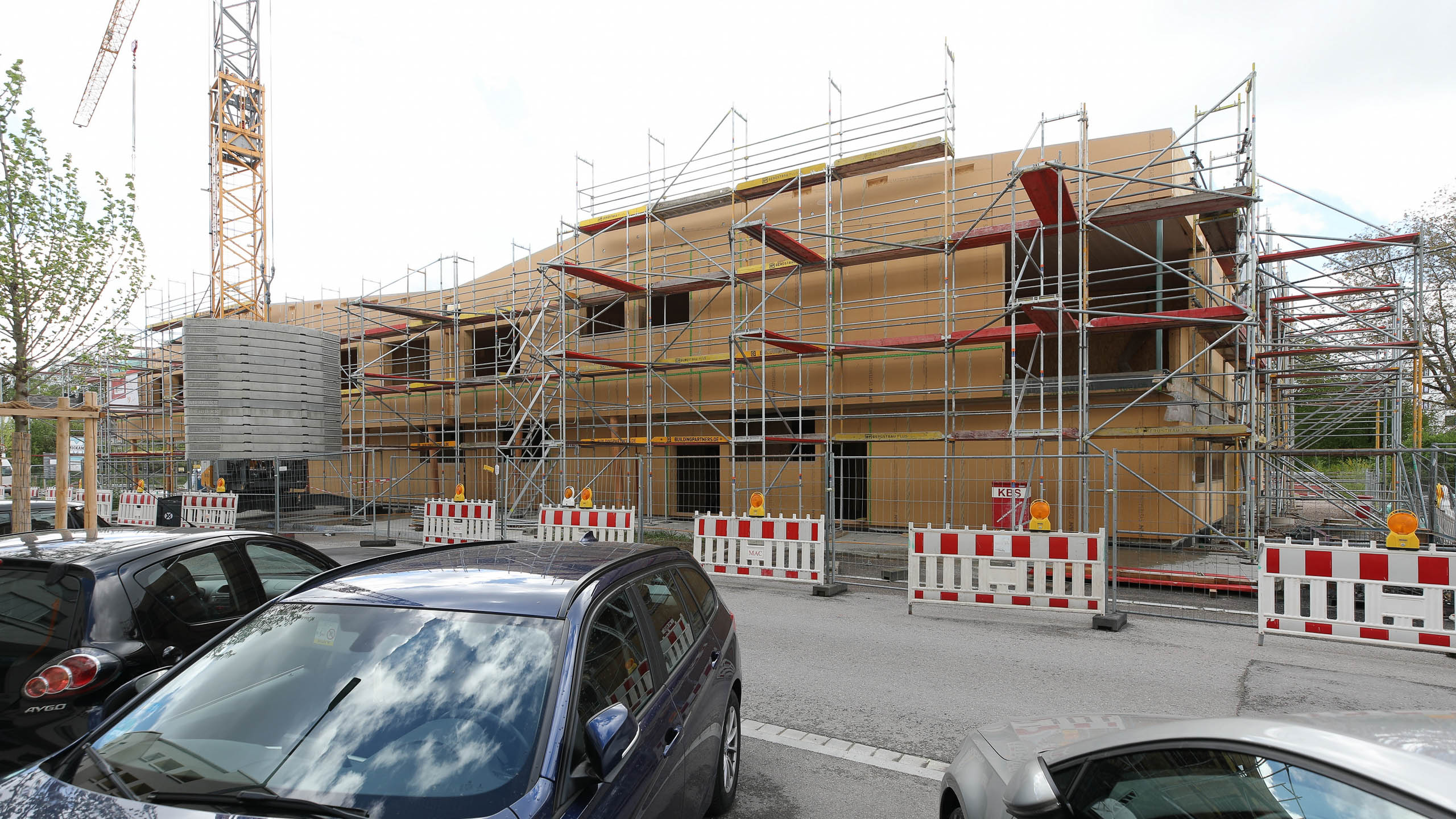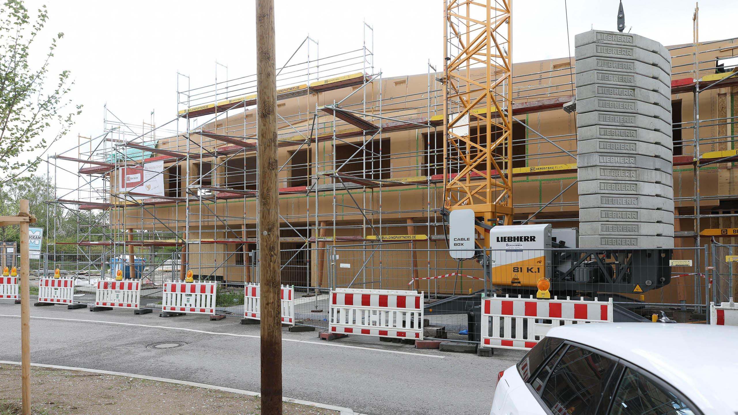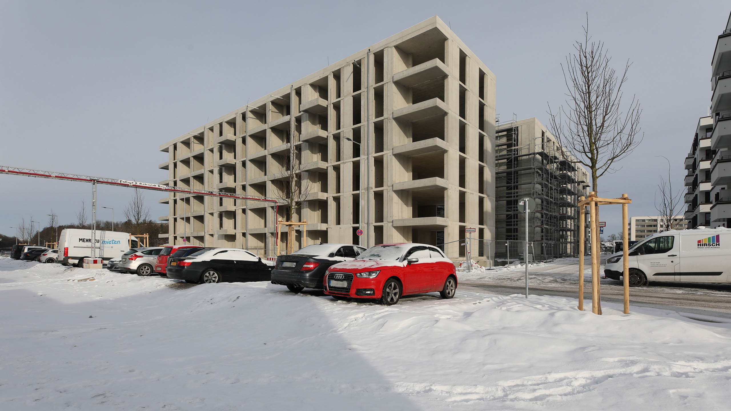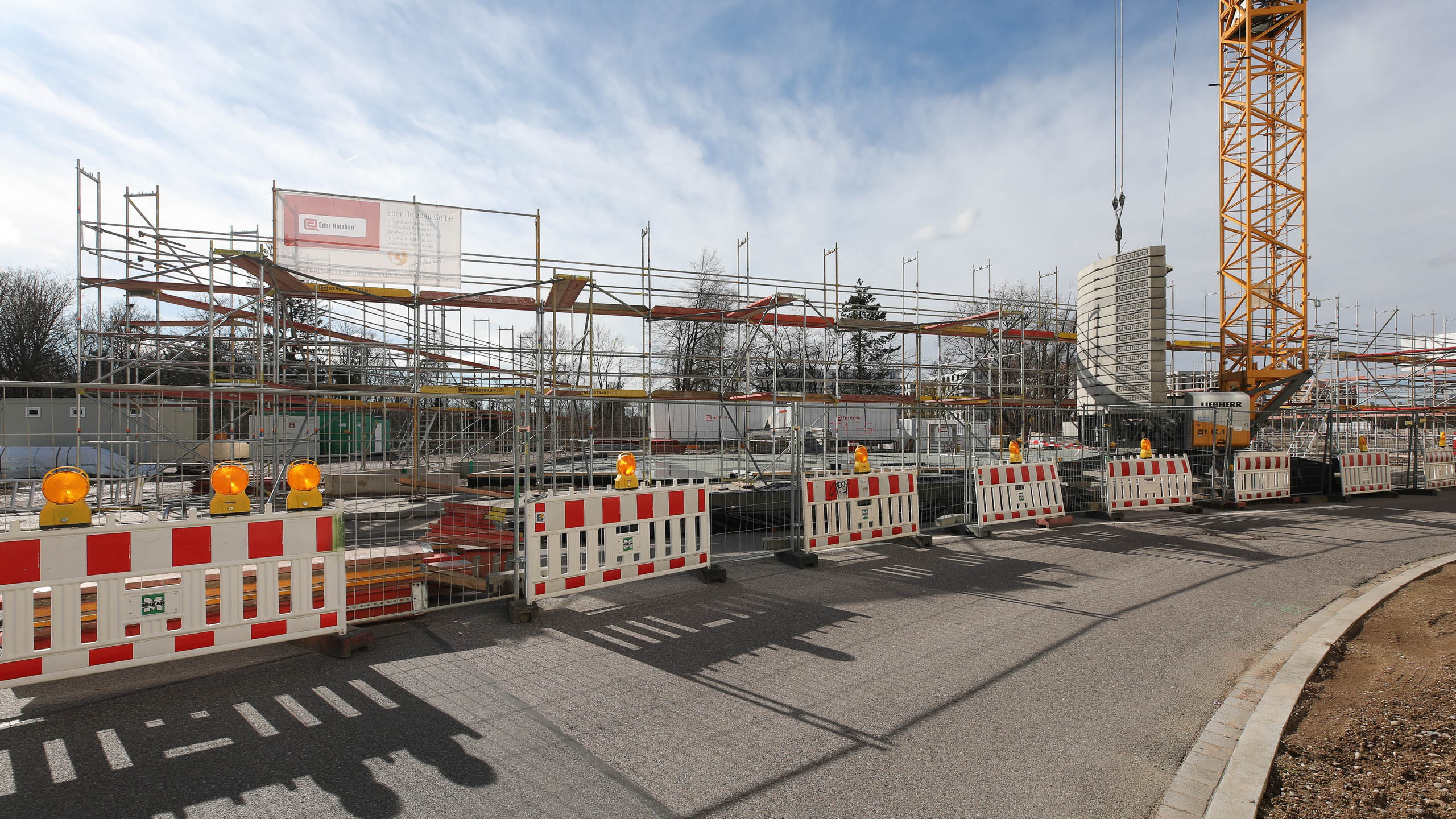 Nachdem die Pfahlgründung beendet wurde, starten nun die Hochbauarbeiten. Gestern wurde der erste Kran aufgestellt.