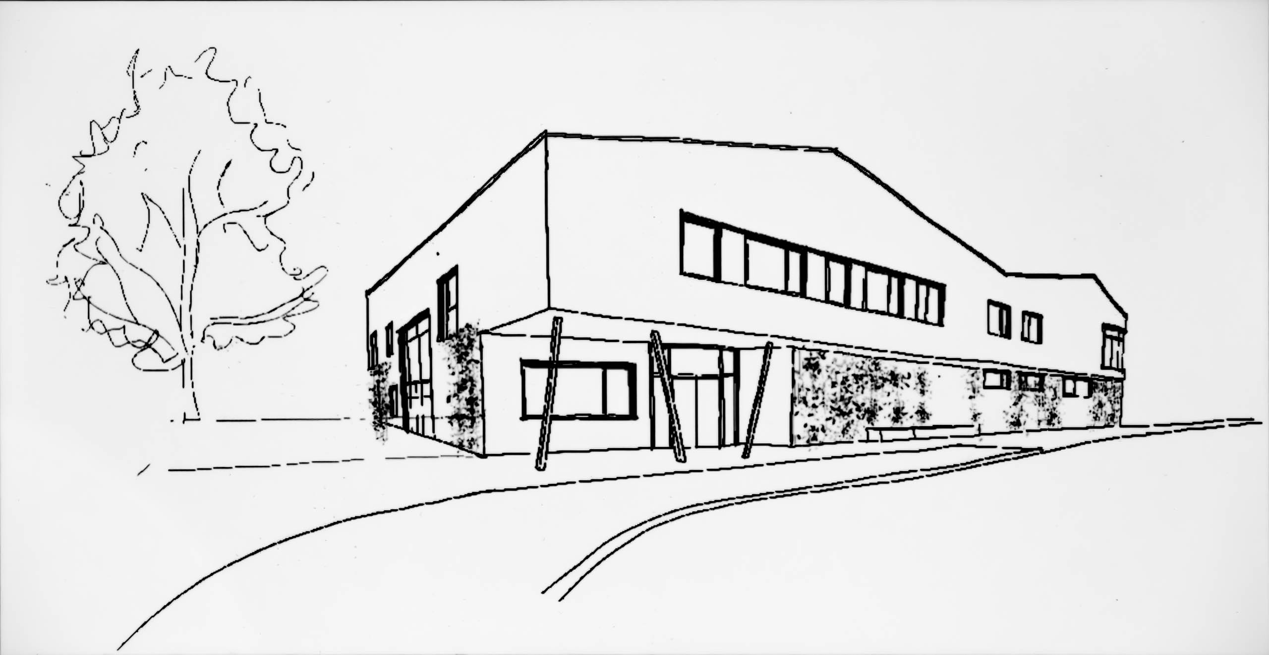 Mehrzweckgebäude, zur Straße ebenerdiger und zum Schulhof zweigeschossiger Sichtbetonbau mit bewegter Dachlandschaft auf polygonalem Grundriss, hofseitig mit großzügiger Durchfensterung, Terrassen und Treppenanlage und abgesenktem Außenbereich, von Bernhard von Busse und Eberhard Schunck, 1973-75.