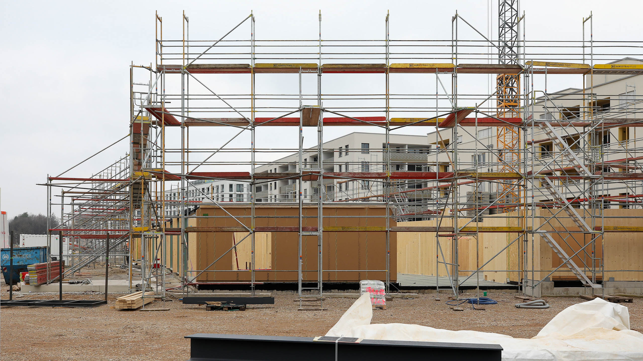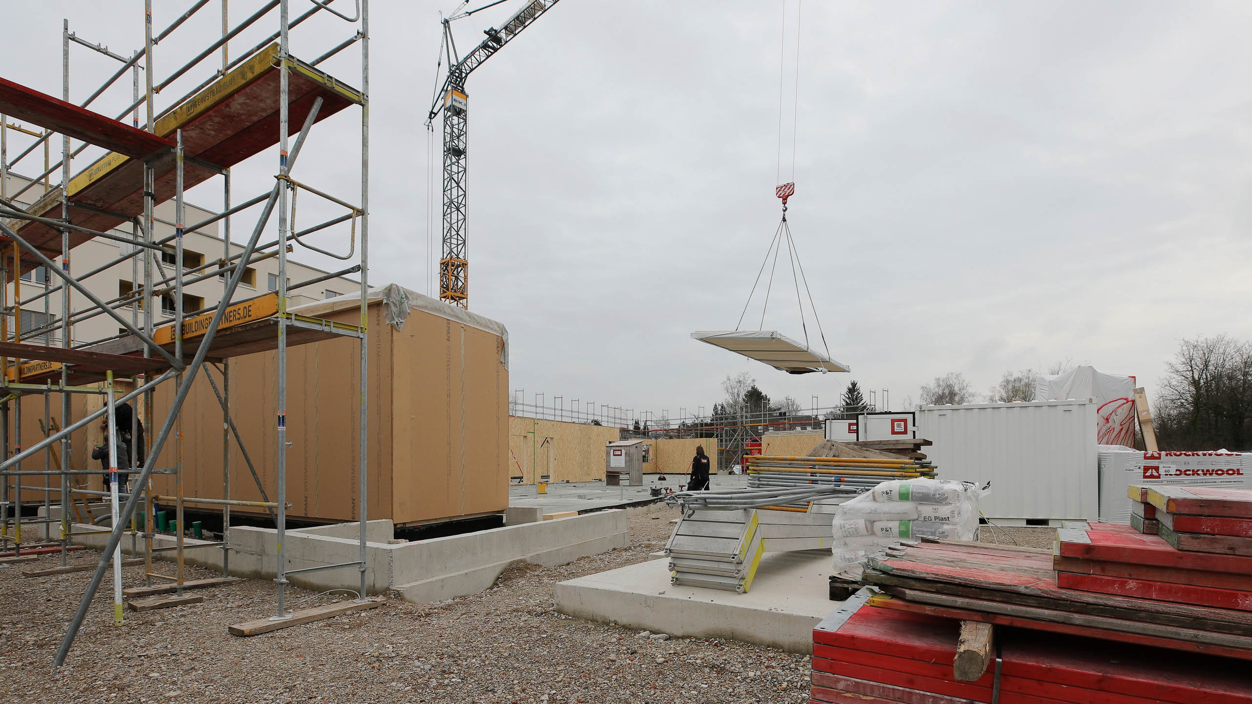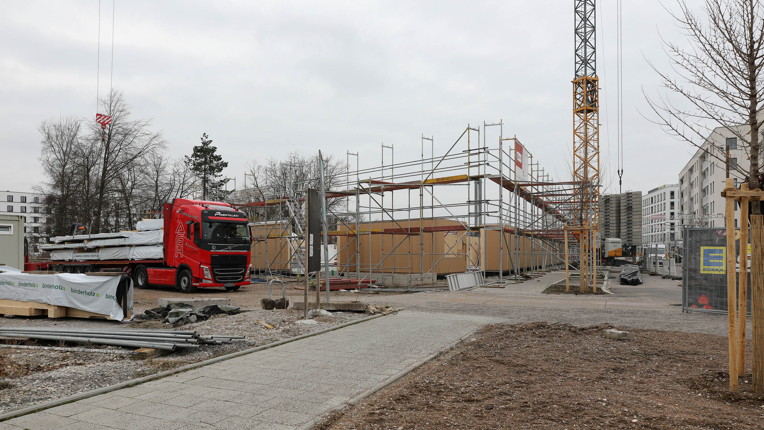 Auch wenn die einzelnen Gebäude bereits die endgültige Höhe erreicht haben, fehlt hier und da etwas Entscheidendem. Etwa Treppen. In dieser Fotoserie sind zwei angelieferte Teile zu sehen. Das längere ist eine tragende Unterkonstruktion, auf die noch die eigentliche, wesentlich breitere Treppe montiert wird.