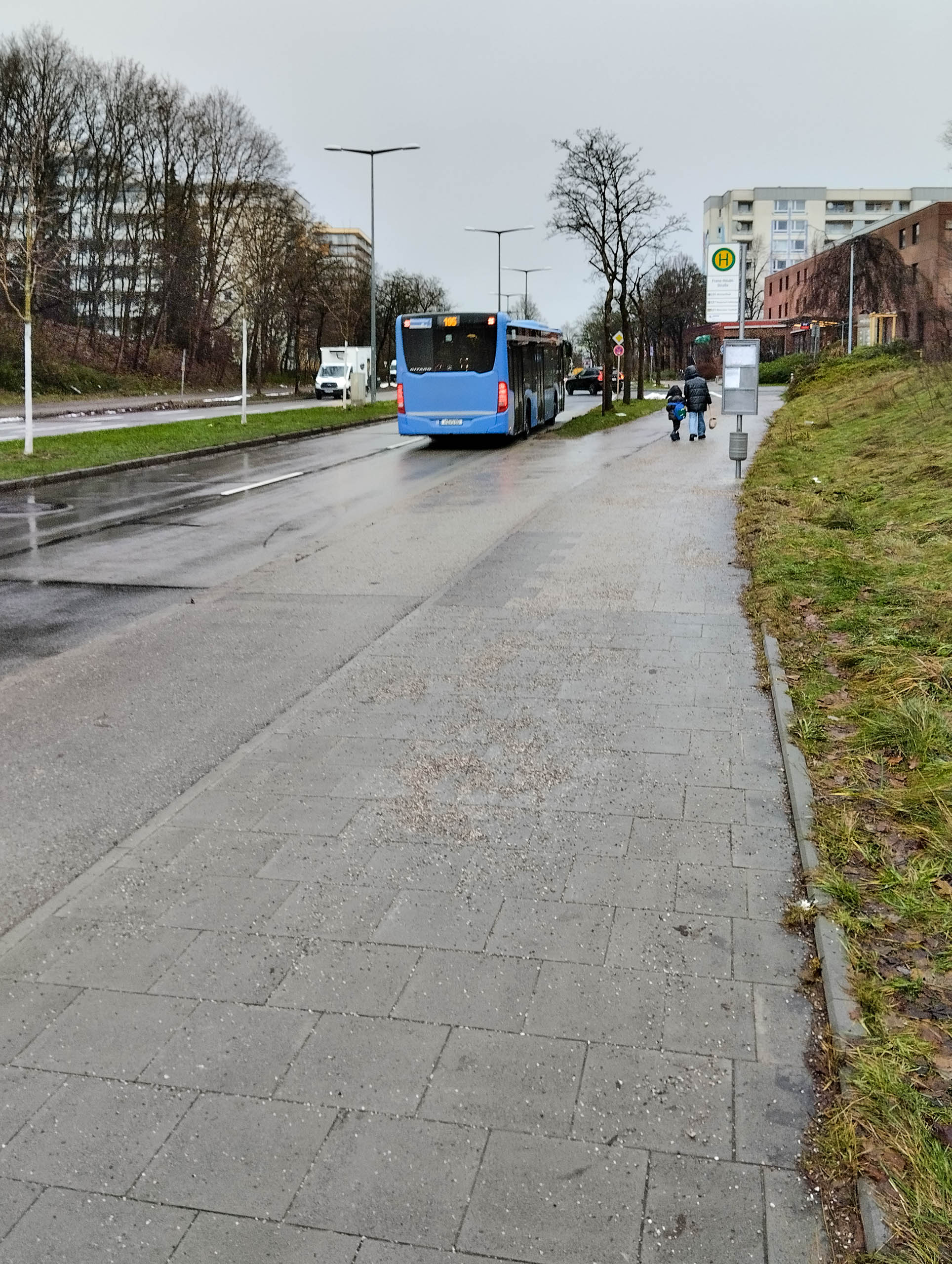 Heute Mittag wurde der Gehweg freigegeben. Der normale Weg (Neuperlacher Fußwegsystem) wurde repariert, das kurze Stück zur neuen Trafostation, die im Vergleich zum alten Trafohäuschen etwas nach hinten versetzt wurde, neu gepflastert. Eventuell muss noch Sand in die Plattenzwischenräume einmassiert werden, aber das war es dann.