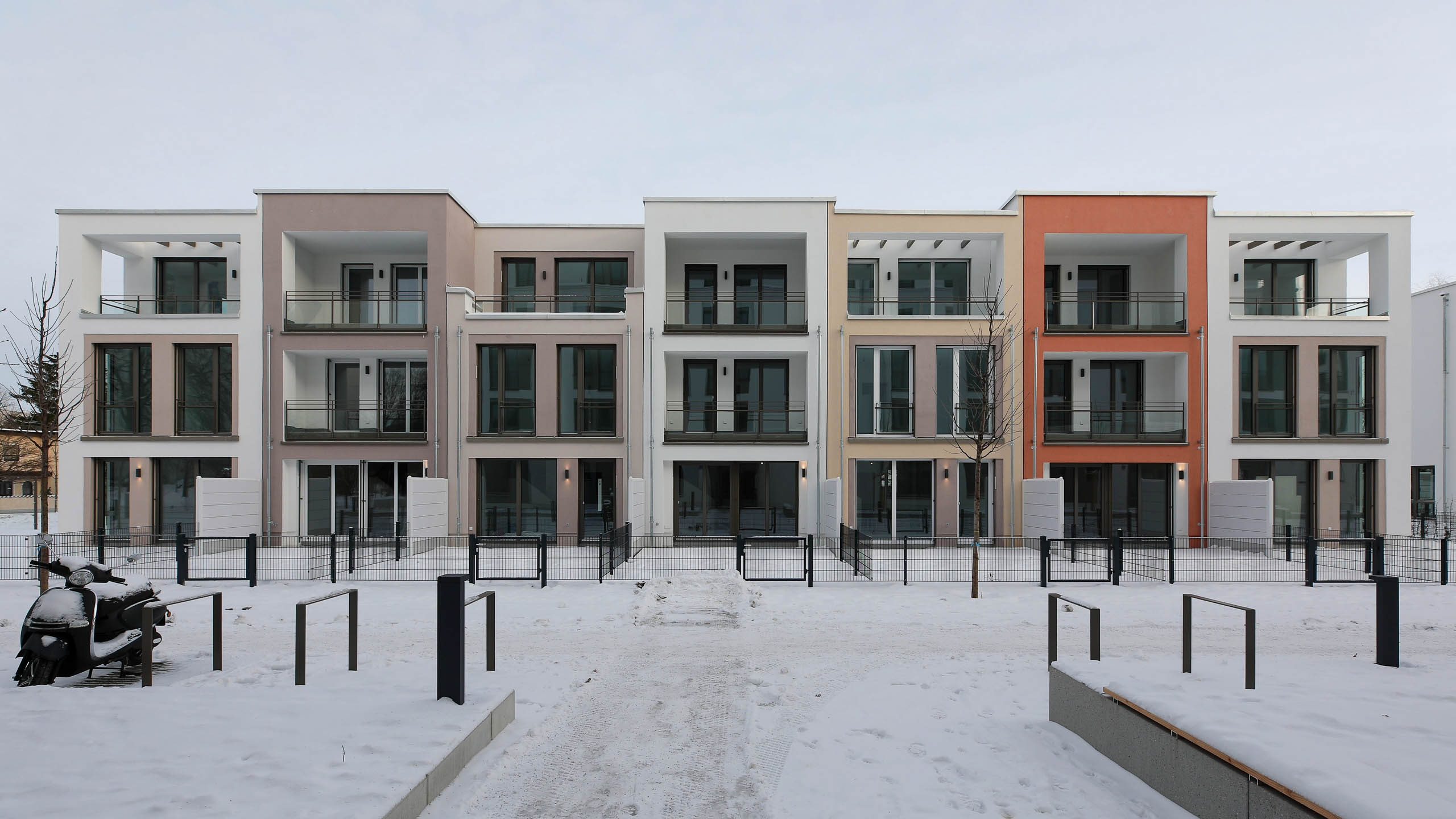 Nochmals getrennt wurde die Farbgestaltung von einem Baukünstler behandelt, der als Basis folgendes vorsah: hellgrau für den Putz (die Regel, mit wenigen Ausnahmen), weiß für alle glatten Betonelemente, weiß für die meisten Fensterrahmen, anthrazit für die Kellerwände, durchgehende vertikale anthrazitfarbige Streifen für Treppenhausfenster und deren Zwischendecken. Die Treppenhäuser selbst konnten sowohl weiß als auch hellgrau sein. Es gab dann farbige Flächen in den Rücksprüngen der Eingangsfassaden oder an den Hauswänden innerhalb der Balkone. Oft hatten in diesem Fall Fensterrahmen und die umgebende Wand dieselbe Farbe oder es wurden waagrechte oder auch senkrechte Streifen gemalt, um Fenstergruppen zu verbinden, typisch hierfür waren anthrazitfarbene Flächen, die die weißen Wohnzimmerfenster zu vertikalen Streifen verbanden. Es gab außerdem z.B. anthrazitfarbene Fensterrahmen mit ockerfarbenen Brüstungen, blaugraue Fensterrahmen innerhalb einer Wand derselben Farbe, graugrüne Fensterrahmen mit grau-lila Verbindungsstreifen u.a.