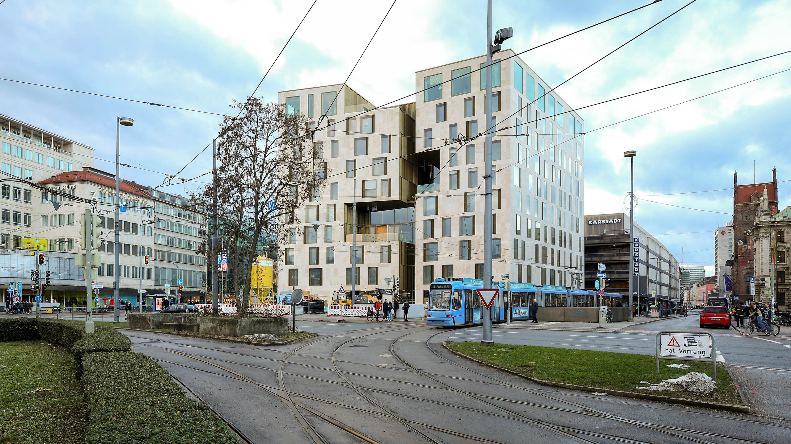Mit der Fassadenform wird der außerdem ohnehin schon runde Charakter des Stachus (Google-Maps zeigt das ganz gut) nun auch über die Hotelfassade betont und fortgeführt, was der alte Bau mit seiner geraden Fassade nicht leistete. Die Fassadenteile sind dabei unregelmäßig ausgeführt, was die Dominanz noch verstärken dürfte. In Worte ist das schwer zu fassen, daher soll an dieser Stelle an den Entwurf ist dem Artikel der Süddeutschen Zeitung verwiesen werden: Neubau am Stachus – Neunstöckiges Ausrufezeichen