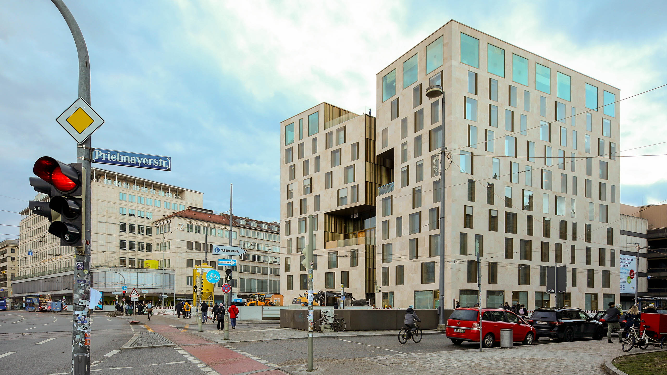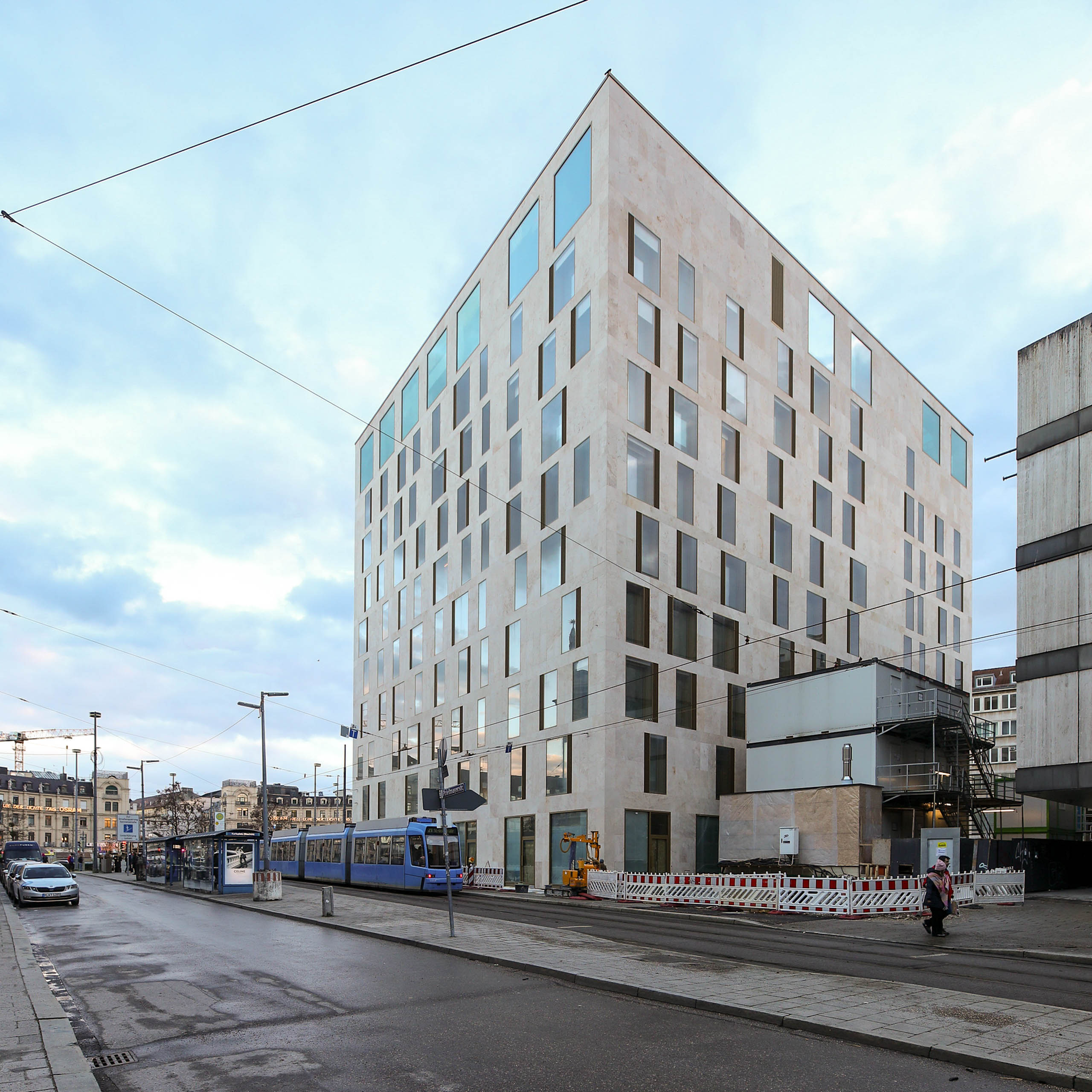 Für den Entwurf des Neubaus zeichnen sich die spanischen Architekten Fuensanta Nieto und Enrique Sobejano verantwortlich. Von der Optik erinnert nichts mehr an das alte Hotel Königshof. Die expressionistische Fassade bietet einen starken Kontrast zu den umliegenden Gebäuden – dem denkmalgeschützten Nachkriegs-Kaufhausbau (vom Stachus-Rondell aus gesehen links) und dem ebenfalls denkmalgeschützten neubarocken Justizpalast (rechts). Dass der Neubau über neun statt sechs Geschosse verfügen wird, geht da schon fast unter.