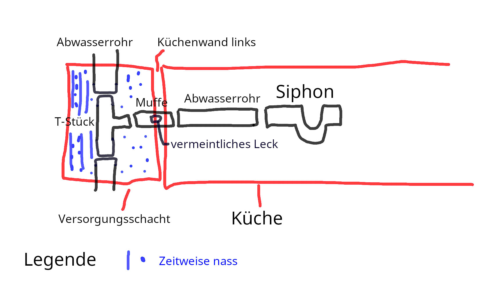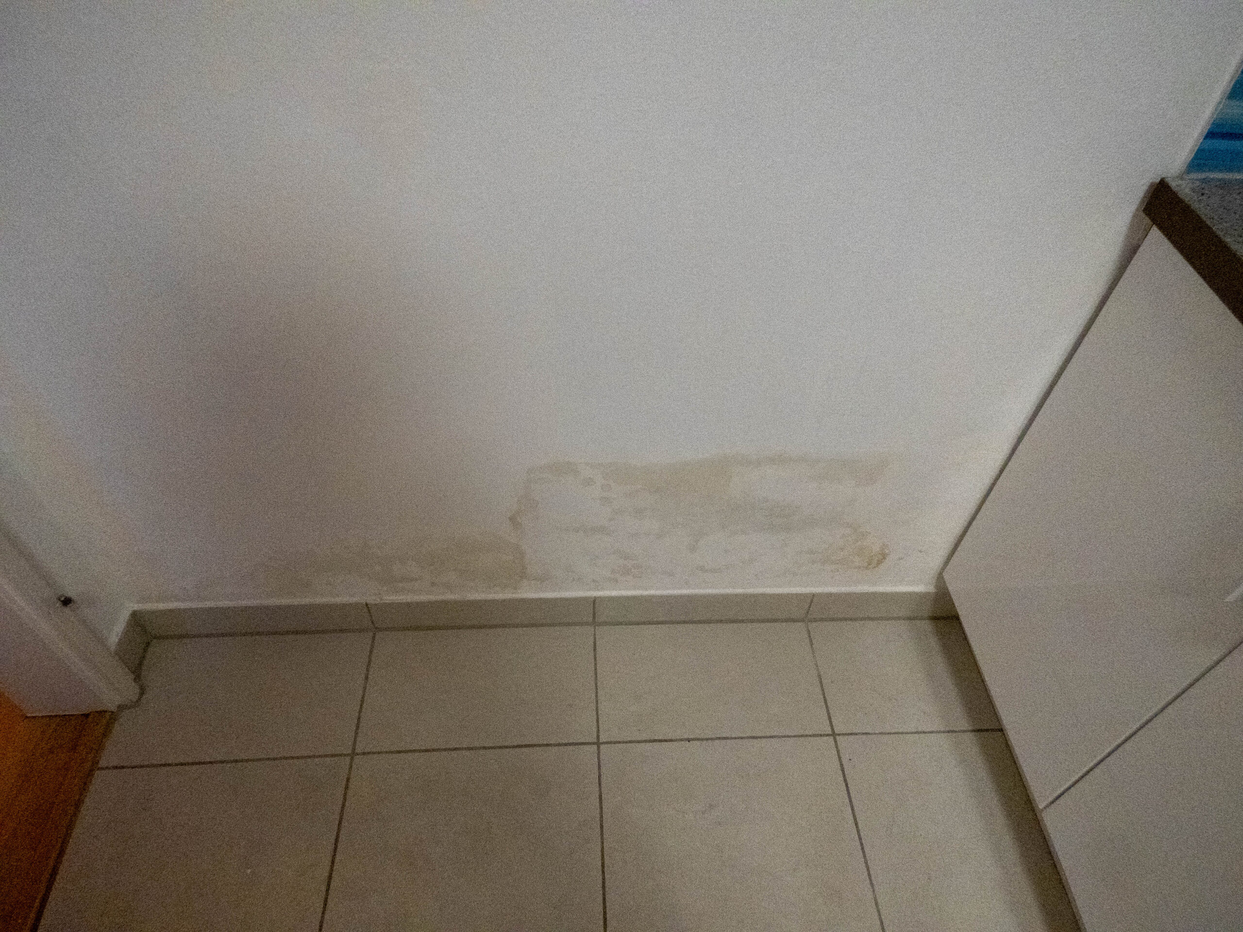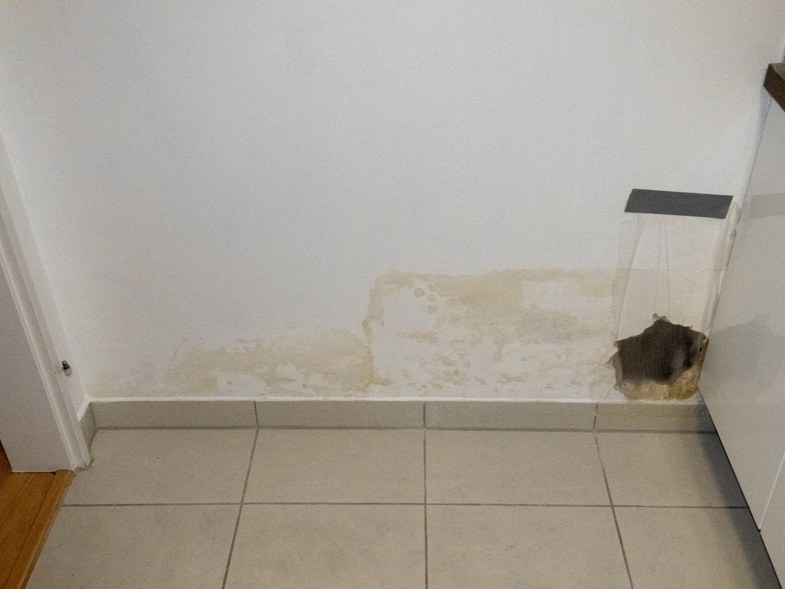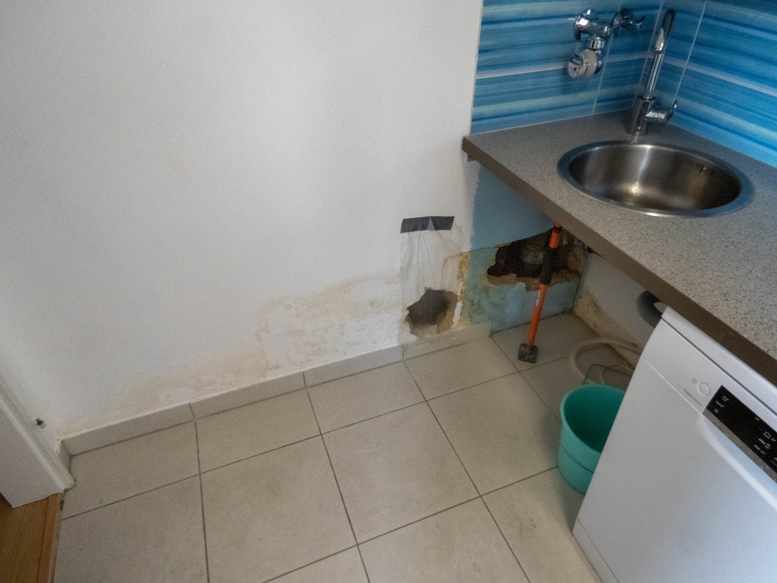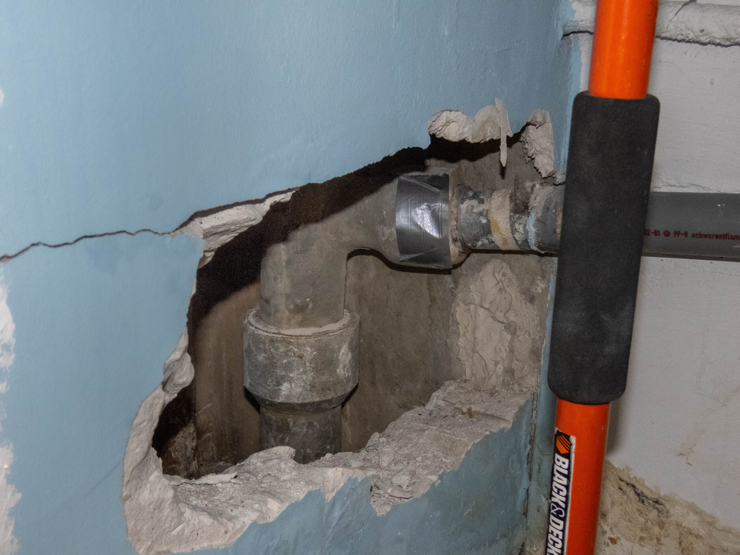 Am 02.10.2024 bemerke ich sehr deutliche Wasserflecken an meiner Küchenwand und informiere die Hausverwaltung, die ein Ortungsteam zu mir schickt. Dieses haut ein großes Loch in die Wand, traf aber die falsche Stelle. Der Spülschrank ist im Weg. Nach dessen Ausbau wird ein weiteres Loch in die Wand geschlagen. Nun kommt man zu dem Ergebnis, dass »wahrscheinlich« die Muffe im Abflussrohr undicht sei. Ich verzichte ab sofort darauf, weiter Wasser in der Küche abzulassen. Doch einige Tage später stelle ich fest, dass im Schacht Wasser von oben herabläuft. Die Vermutung: Das Dach hat ein Leck, was eine spätere Ortung auch bestätigt. Das Dach wurde geflickt, aber man ließ sich bei der Reparatur meiner Küchenwand lange Zeit, obwohl ich oft nachhakte und auch Beiräte einschaltet.