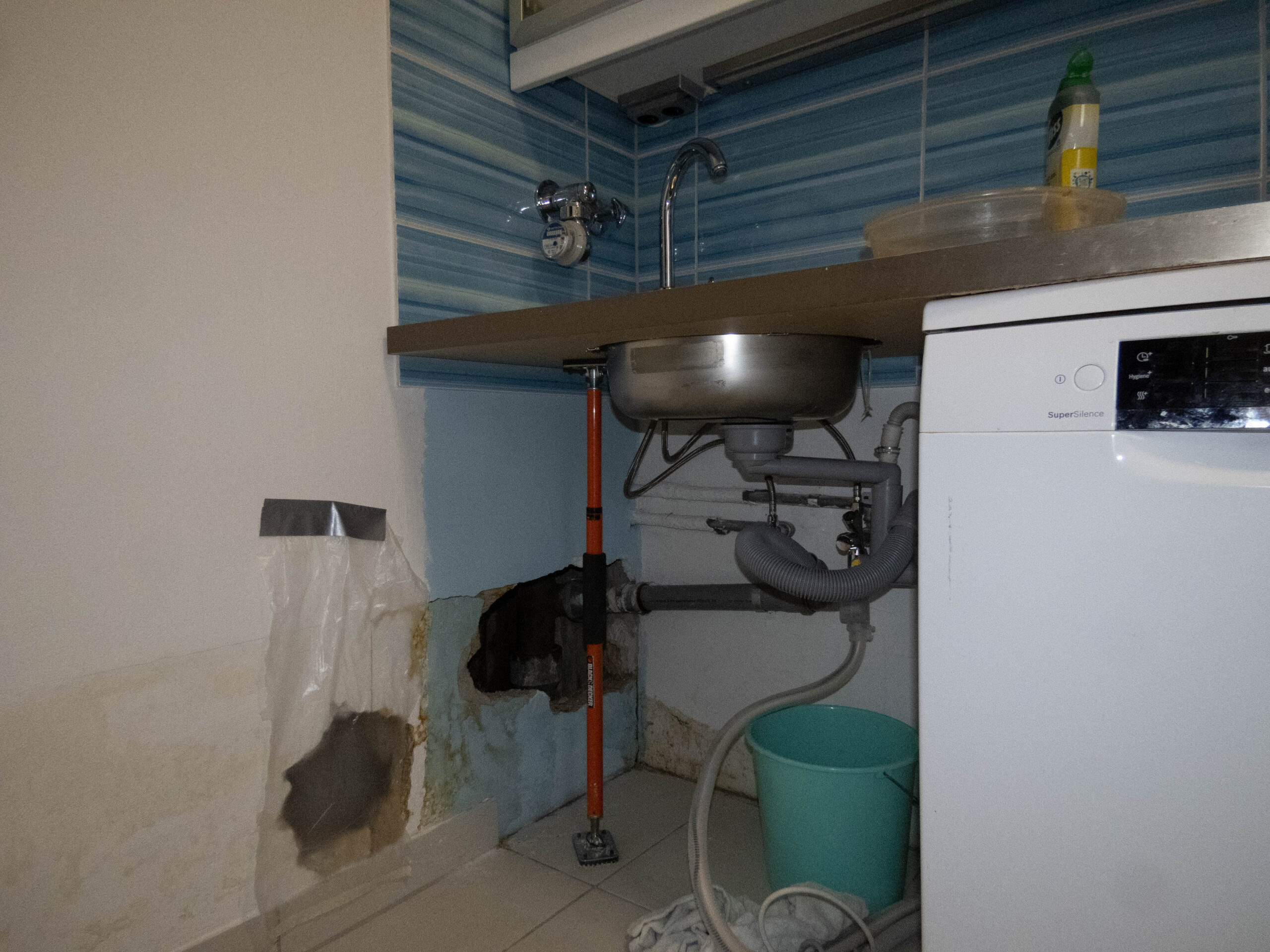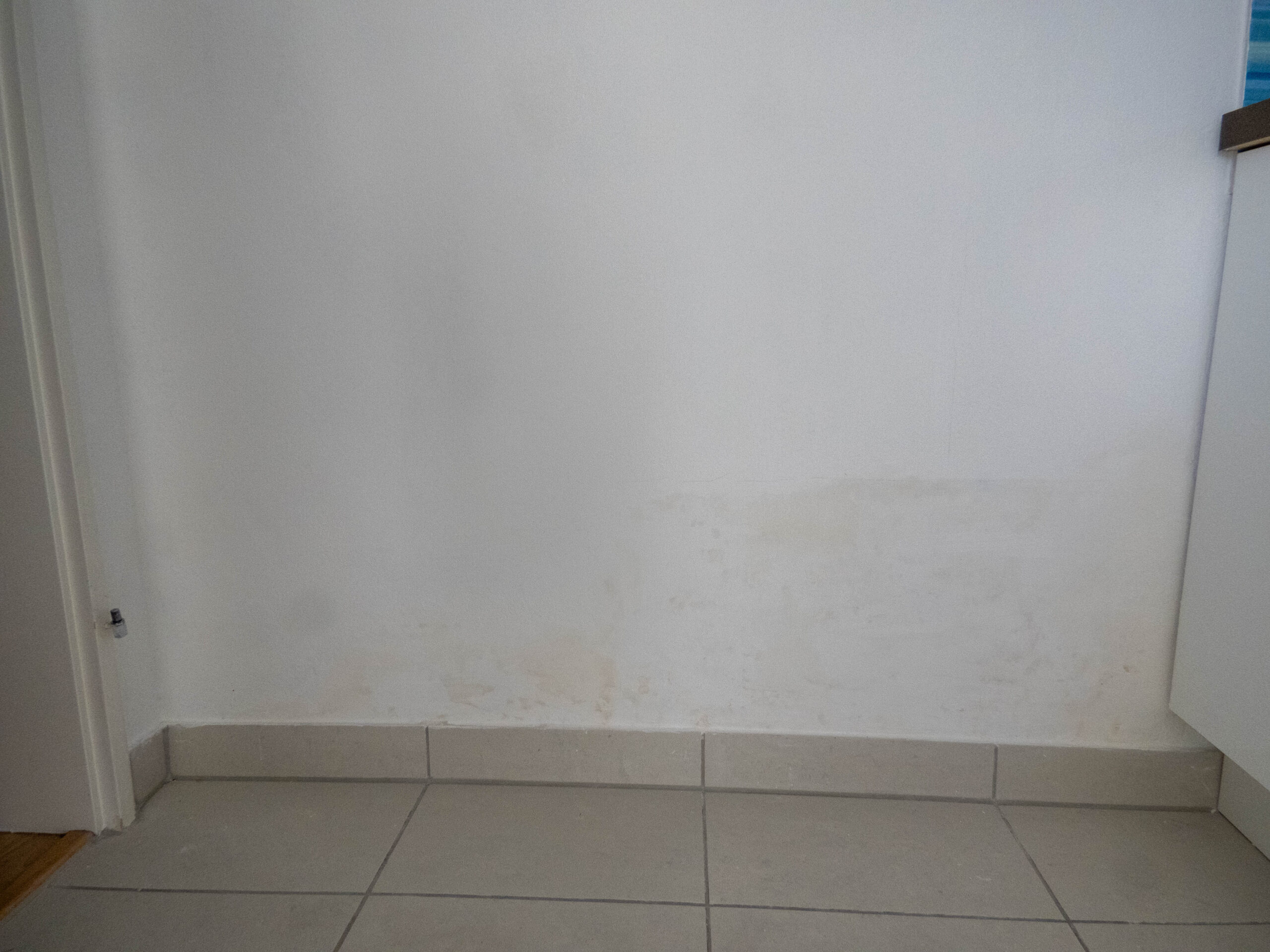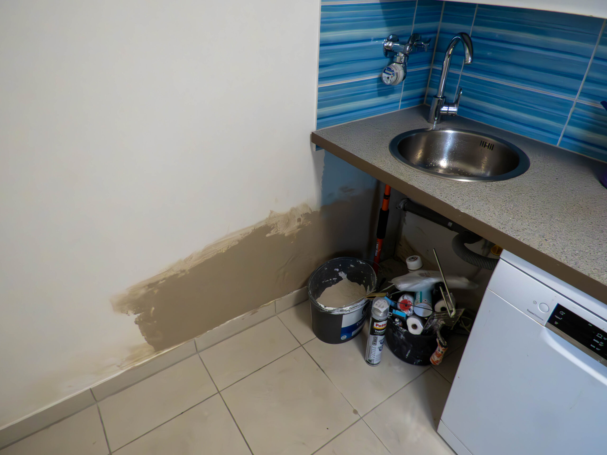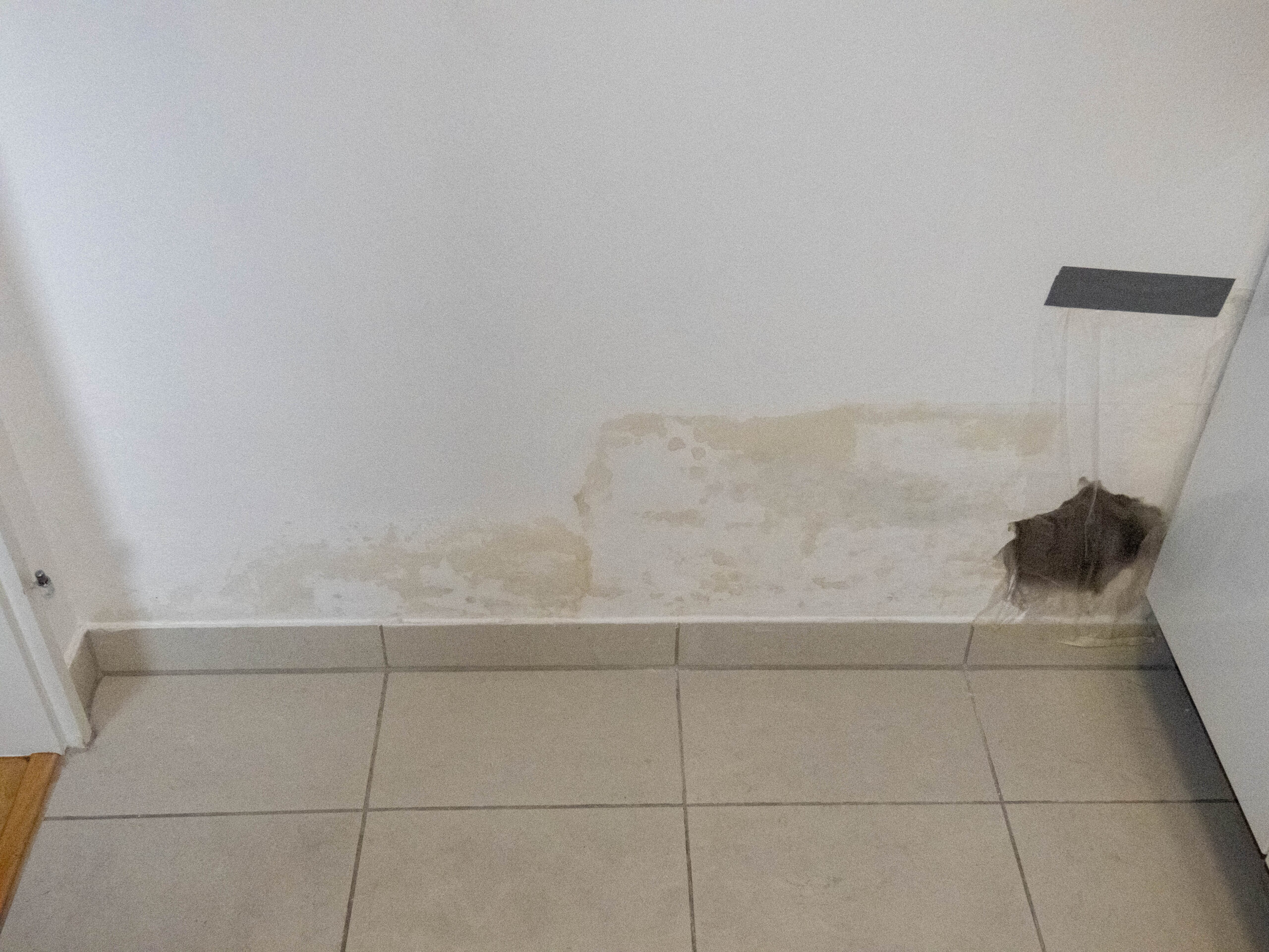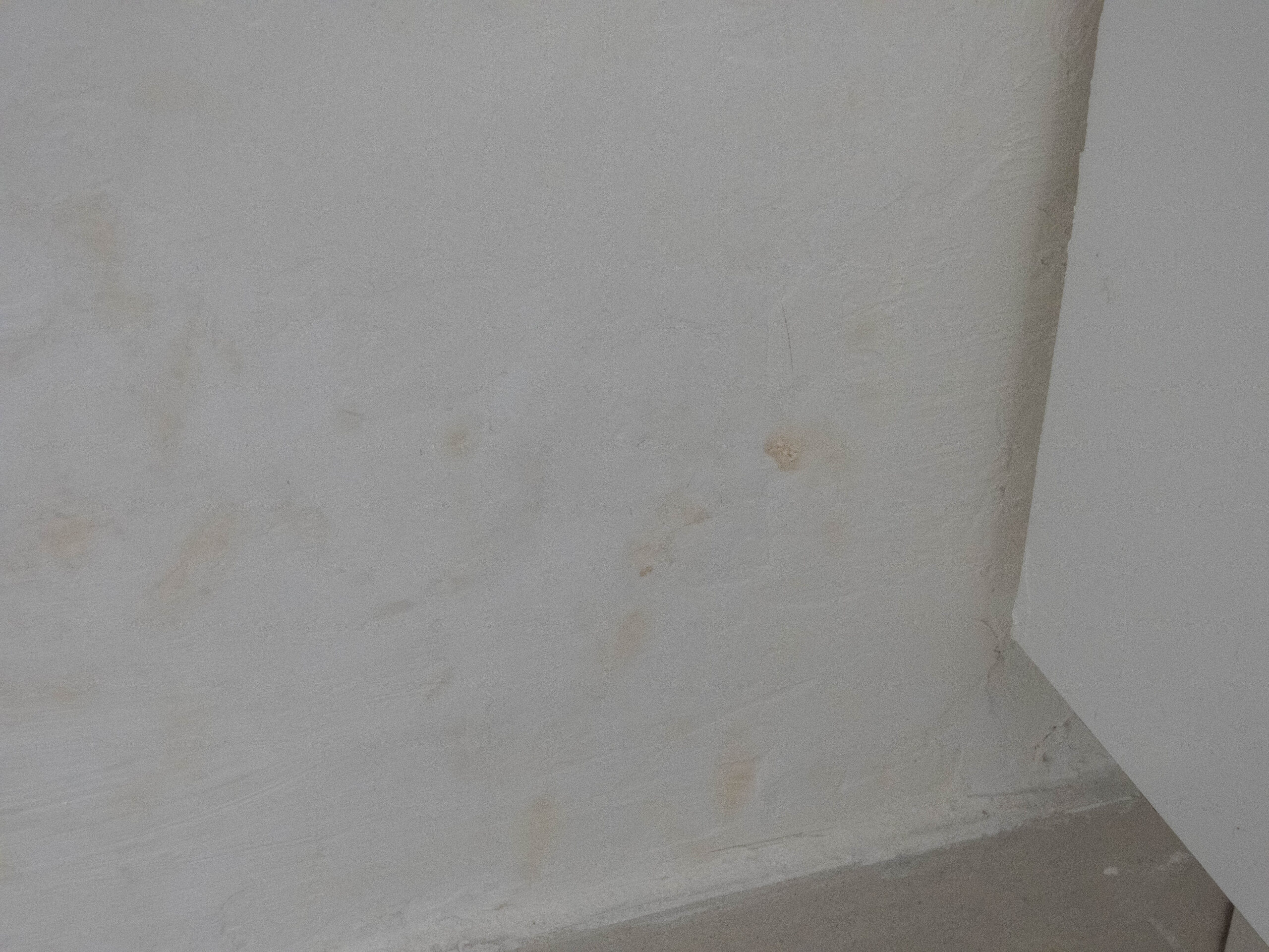 Am 02.10.2024 bemerke ich sehr deutliche Wasserflecken an meiner Küchenwand und informiere die Hausverwaltung, die ein Ortungsteam zu mir schickt. Dieses haut ein großes Loch in die Wand, traf aber die falsche Stelle. Der Spülschrank ist im Weg. Nach dessen Ausbau wird ein weiteres Loch in die Wand geschlagen. Nun kommt man zu dem Ergebnis, dass »wahrscheinlich« die Muffe im Abflussrohr undicht sei. Ich verzichte ab sofort darauf, weiter Wasser in der Küche abzulassen. Doch einige Tage später stelle ich fest, dass im Schacht Wasser von oben herabläuft. Die Vermutung: Das Dach hat ein Leck, was eine spätere Ortung auch bestätigt. Das Dach wurde geflickt, aber man ließ sich bei der Reparatur meiner Küchenwand lange Zeit, obwohl ich oft nachhakte und auch Beiräte einschaltet.