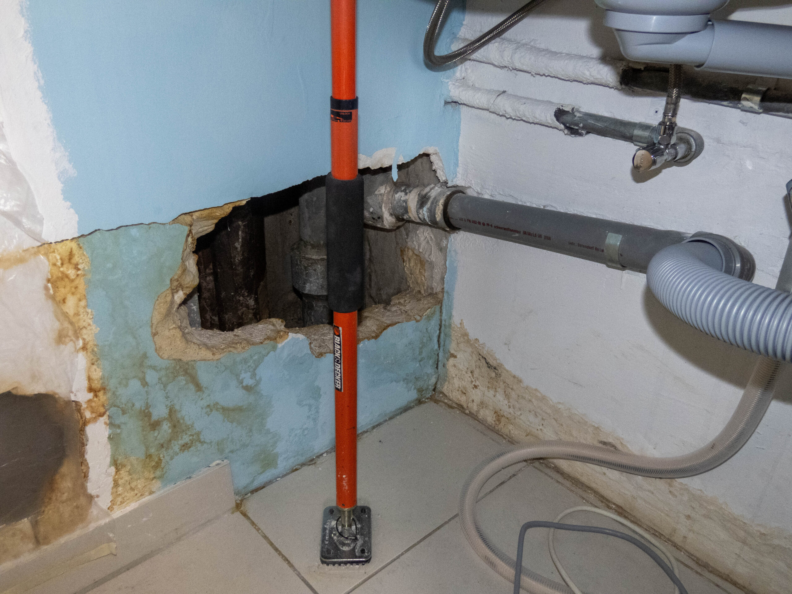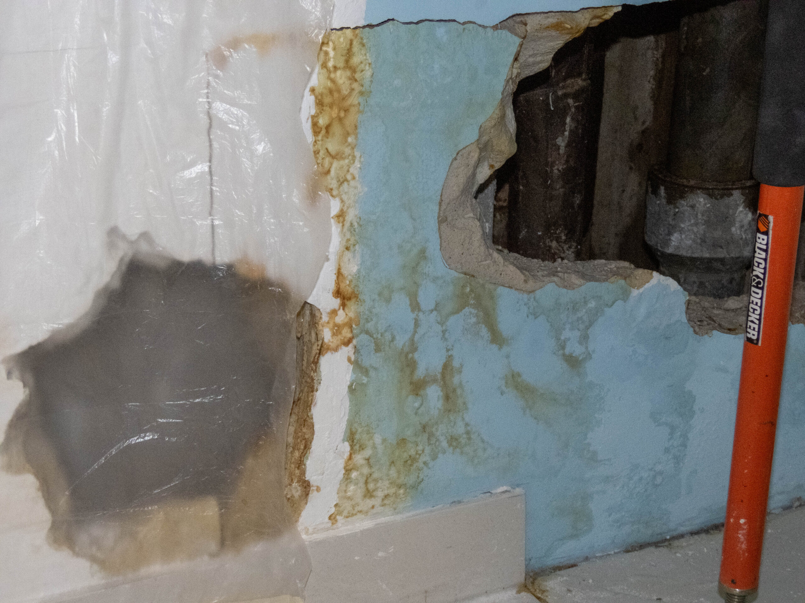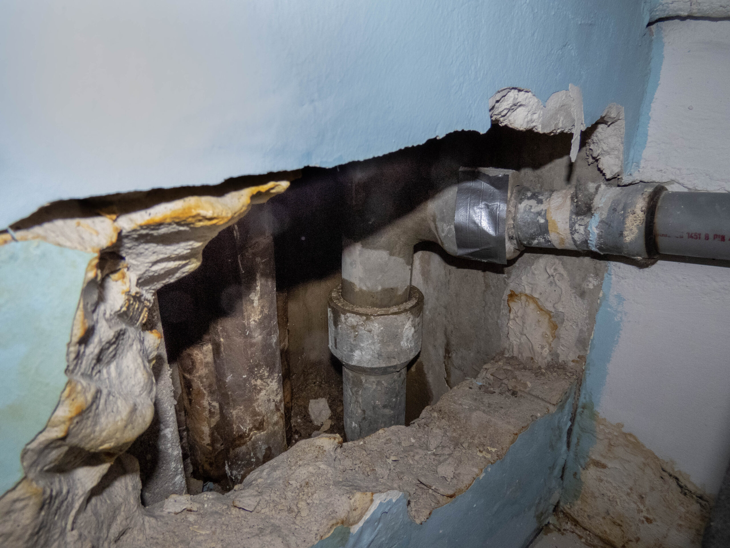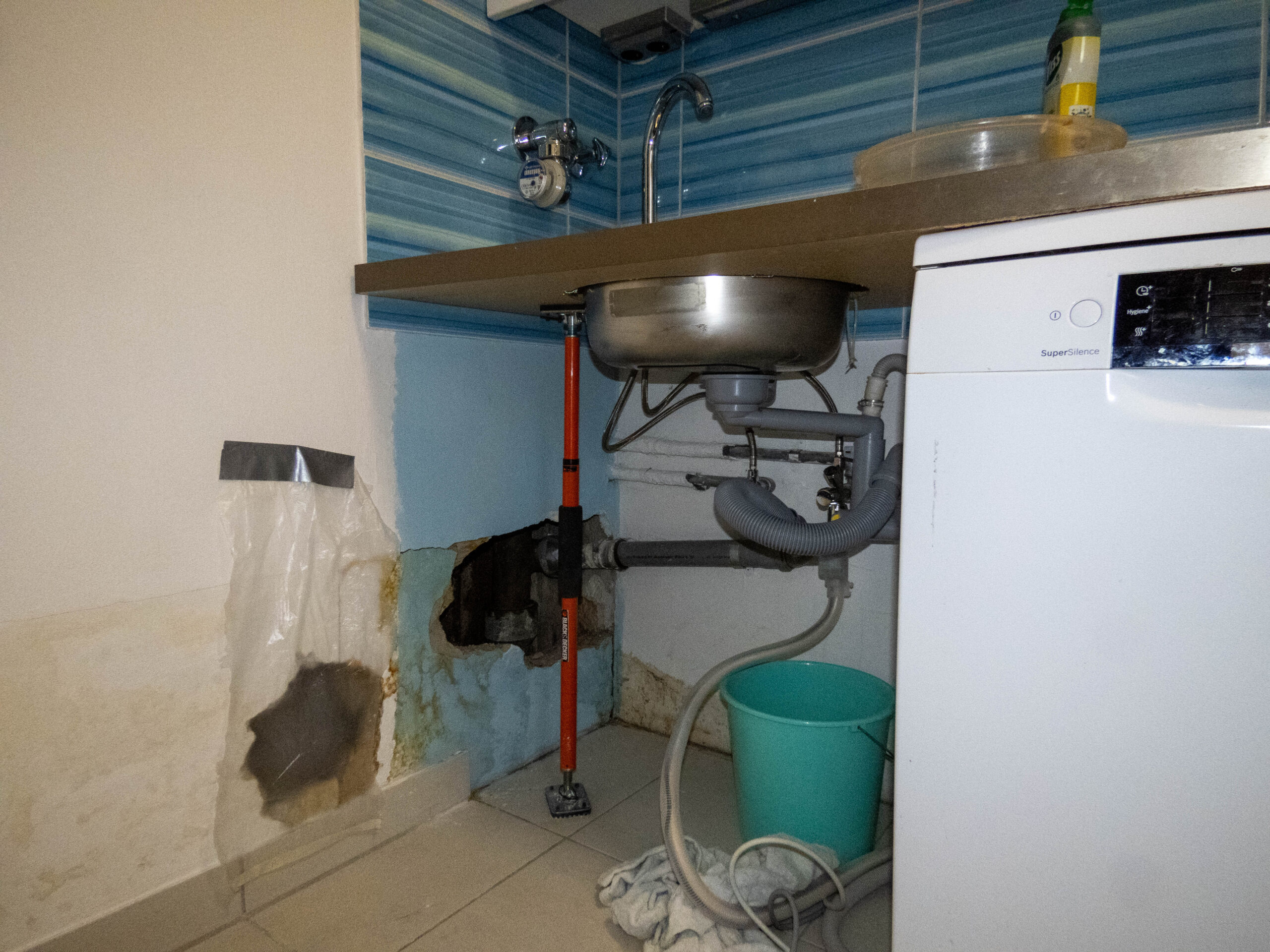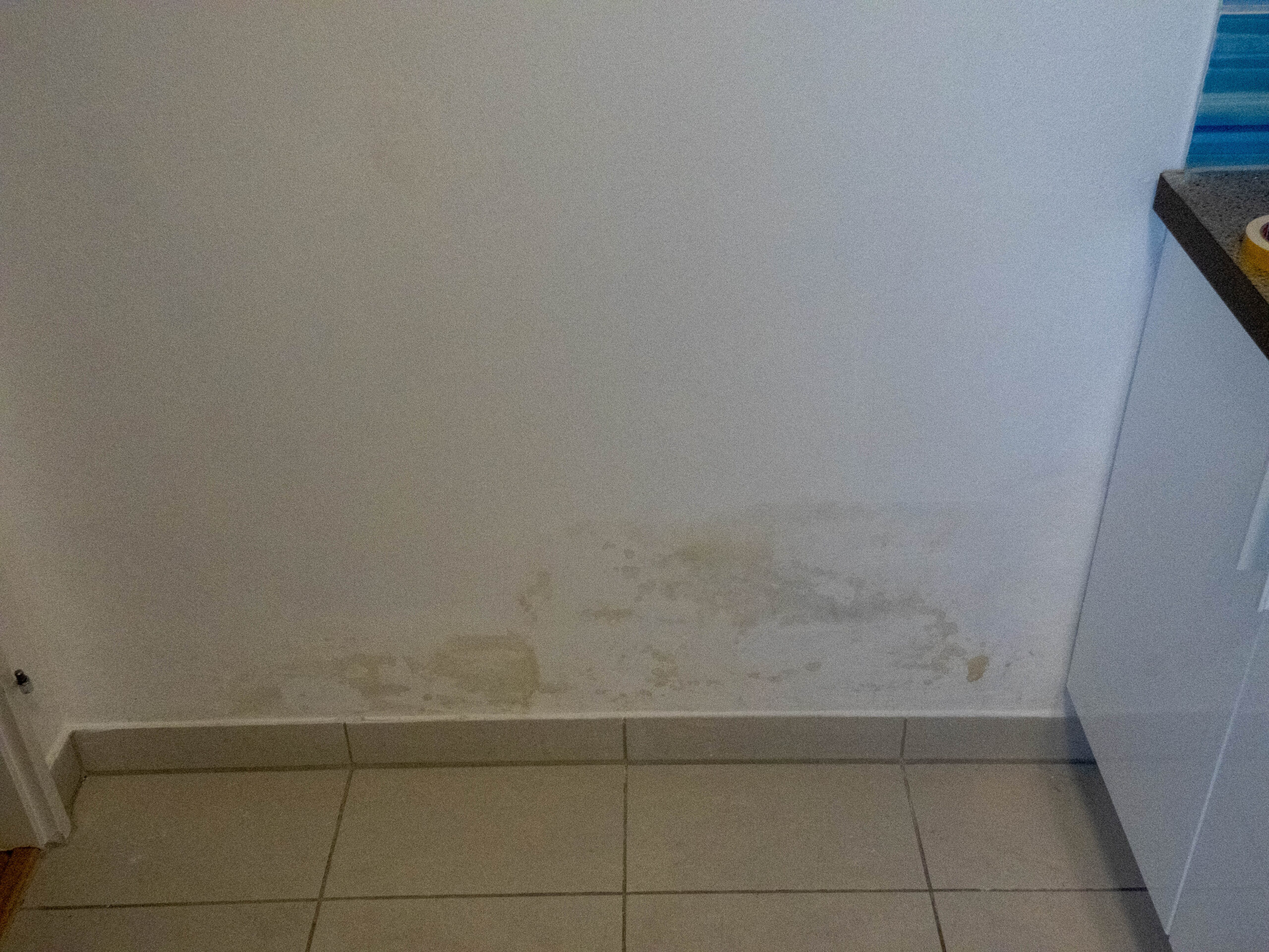 Am 02.10.2024 bemerke ich sehr deutliche Wasserflecken an meiner Küchenwand und informiere die Hausverwaltung, die ein Ortungsteam zu mir schickt. Dieses haut ein großes Loch in die Wand, traf aber die falsche Stelle. Der Spülschrank ist im Weg. Nach dessen Ausbau wird ein weiteres Loch in die Wand geschlagen. Nun kommt man zu dem Ergebnis, dass »wahrscheinlich« die Muffe im Abflussrohr undicht sei. Ich verzichte ab sofort darauf, weiter Wasser in der Küche abzulassen. Doch einige Tage später stelle ich fest, dass im Schacht Wasser von oben herabläuft. Die Vermutung: Das Dach hat ein Leck, was eine spätere Ortung auch bestätigt. Das Dach wurde geflickt, aber man ließ sich bei der Reparatur meiner Küchenwand lange Zeit, obwohl ich oft nachhakte und auch Beiräte einschaltet.